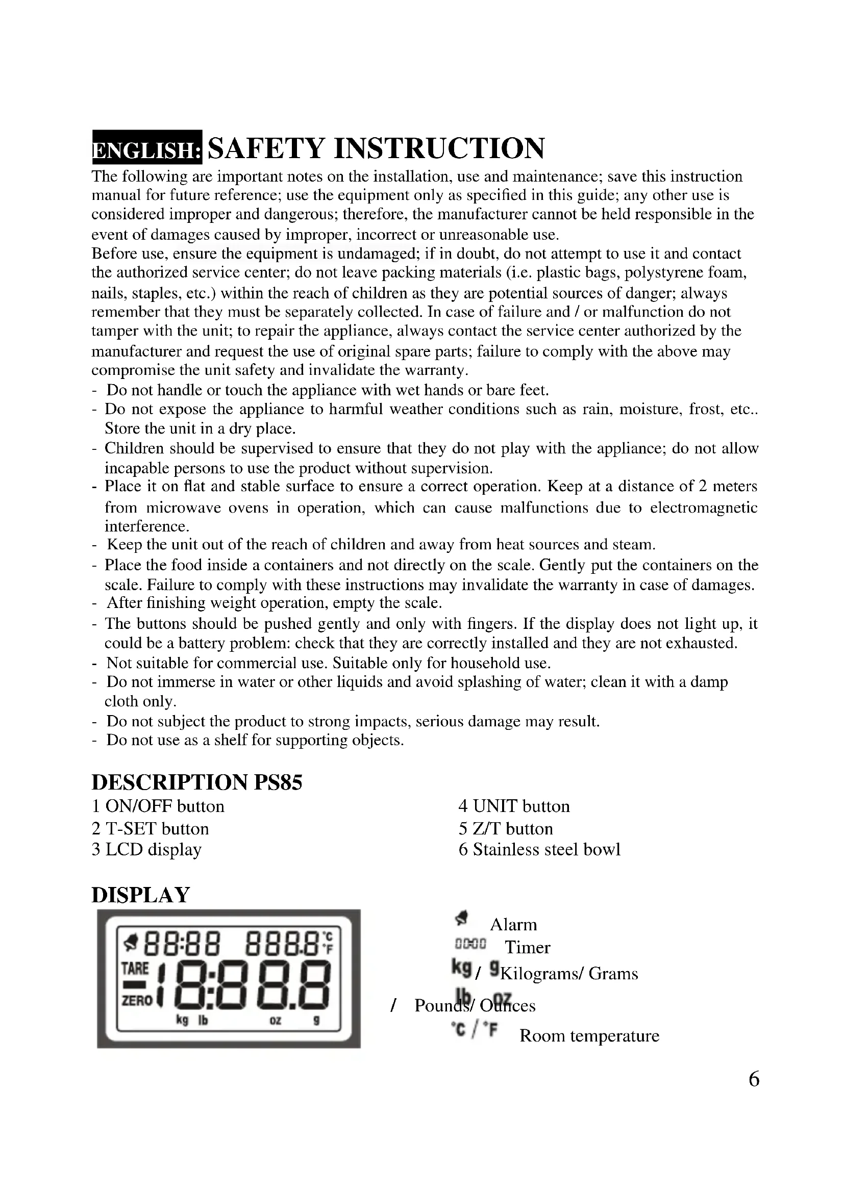 The following are important notes on the installation, use and maintenance; save this instruction manual for future reference; use the equipment only as specified in this guide; any other use is considered improper and dangerous; therefore, the manufacturer cannot be held responsible in the event of damages caused by improper, incorrect or unreasonable use. Before use, ensure the equipment is undamaged; if in doubt, do not attempt to use it and contact the authorized service center; do not leave packing materials (i.e. plastic bags, polystyrene foam, nails, staples, etc.) within the reach of children as they are potential sources of danger; always remember that they must be separately collected. In case of failure and / or malfunction do not tamper with the unit; to repair the appliance, always contact the service center authorized by the manufacturer and request the use of original spare parts; failure to comply with the above may compromise the unit safety and invalidate the warranty. - Do not handle or touch the appliance with wet hands or bare feet. - Do not expose the appliance to harmful weather conditions such as rain, moisture, frost, etc.. Store the unit in a dry place. - Children should be supervised to ensure that they do not play with the appliance; do not allow incapable persons to use the product without supervision. - Place it on flat and stable surface to ensure a correct operation. Keep at a distance of 2 meters from microwave ovens in operation, which can cause malfunctions due to electromagnetic interference. - Keep the unit out of the reach of children and away from heat sources and steam. - Place the food inside a containers and not directly on the scale. Gently put the containers on the scale. Failure to comply with these instructions may invalidate the warranty in case of damages. - After finishing weight operation, empty the scale. - The buttons should be pushed gently and only with fingers. If the display does not light up, it could be a battery problem: check that they are correctly installed and they are not exhausted. - Not suitable for commercial use. Suitable only for household use. - Do not immerse in water or other liquids and avoid splashing of water; clean it with a damp cloth only. - Do not subject the product to strong impacts, serious damage may result. - Do not use as a shelf for supporting objects. DESCRIPTION PS85 1 ON/OFF button 2 T-SET button 3 LCD display 4 UNIT button 5 Z/T button 6 Stainless steel bowl DISPLAY Alarm Timer / Kilograms/ Grams / Pounds/ Ounces Room temperature7 BUTTONS DESCRIPTION ON/OFF button (1): Press to turn on/off the unit T-SET button (2): Press enter timer setting UNIT button (4): Press to change unit and set timer Z/T button (5): Press to use Tare
