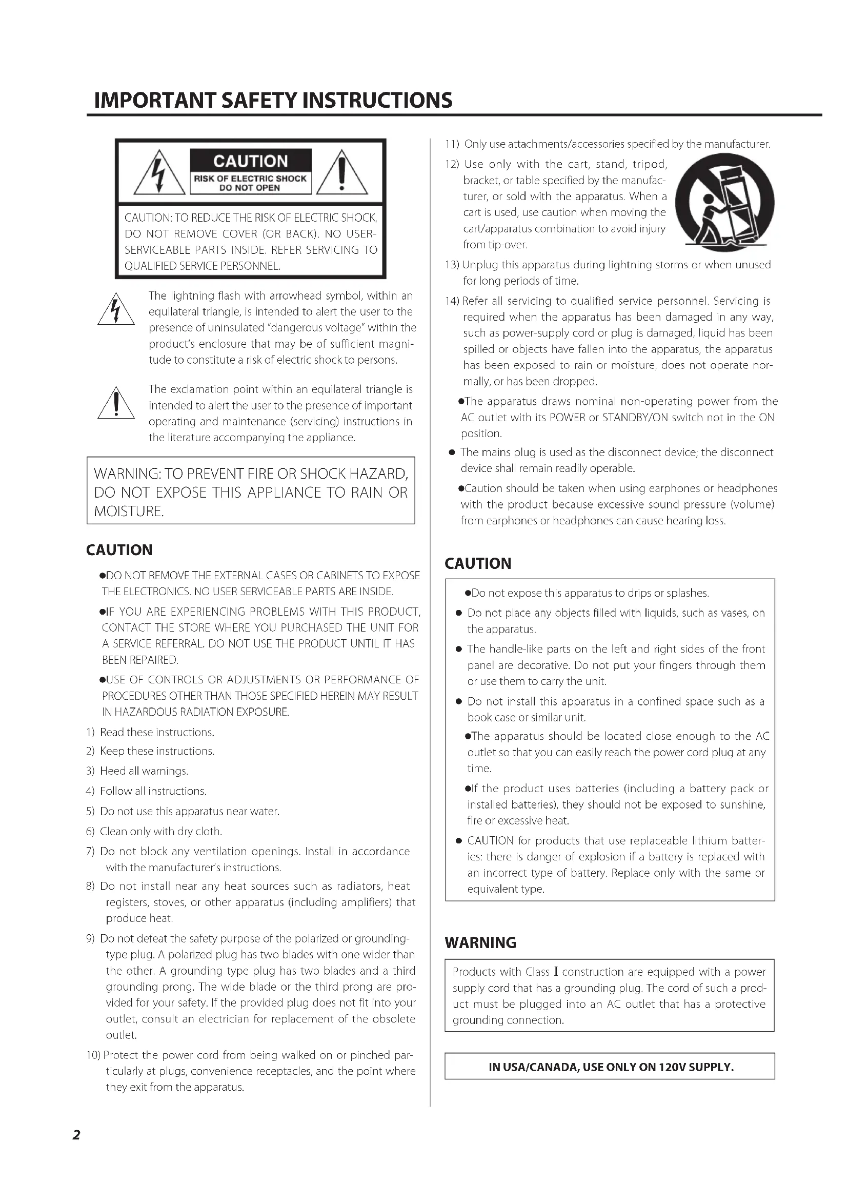 required when the apparatus has been damaged in any way, such as power-supply cord or plug is damaged, liquid has been spilled or objects have fallen into the apparatus, the apparatus has been exposed to rain or moisture, does not operate nor- mally, or has been dropped. o The apparatus draws nominal non-operating power from the AC outlet with its POWER or STANDBY/ON switch not in the ON position. o The mains plug is used as the disconnect device; the disconnect device shall remain readily operable. o Caution should be taken when using earphones or headphones with the product because excessive sound pressure (volume) from earphones or headphones can cause hearing loss. CAUTION o Do not expose this apparatus to drips or splashes. o Do not place any objects filled with liquids, such as vases, on the apparatus. o The handle-like parts on the left and right sides of the front panel are decorative. Do not put your fingers through them or use them to carry the unit. o Do not install this apparatus in a confined space such as a book case or similar unit. o The apparatus should be located close enough to the AC outlet so that you can easily reach the power cord plug at any time. o If the product uses batteries (including a battery pack or installed batteries), they should not be exposed to sunshine, fire or excessive heat. o CAUTION for products that use replaceable lithium batter- ies: there is danger of explosion if a battery is replaced with an incorrect type of battery. Replace only with the same or equivalent type. WARNING Products with Class ! construction are equipped with a power supply cord that has a grounding plug. The cord of such a prod- uct must be plugged into an AC outlet that has a protective grounding connection. IN USA/CANADA, USE ONLY ON 120V SUPPLY.EN