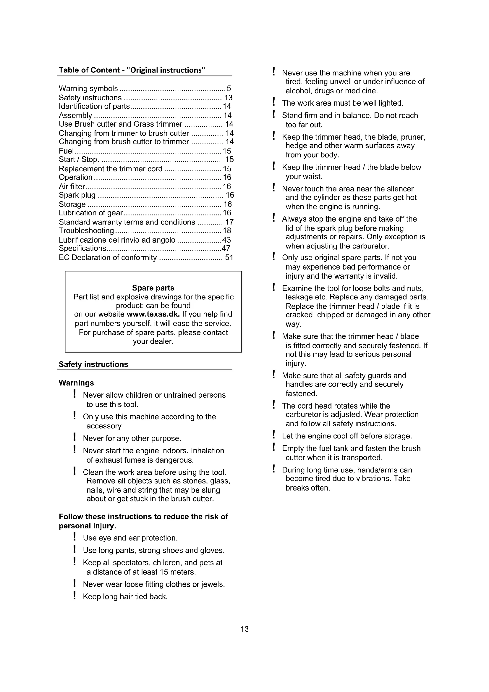 Safety instructions Warnings ! Never allow children or untrained persons to use this tool. ! Only use this machine according to the accessory ! Never for any other purpose. ! Never start the engine indoors. Inhalation of exhaust fumes is dangerous. ! Clean the work area before using the tool. Remove all objects such as stones, glass, nails, wire and string that may be slung about or get stuck in the brush cutter. Follow these instructions to reduce the risk of personal injury. ! Use eye and ear protection. ! Use long pants, strong shoes and gloves. ! Keep all spectators, children, and pets at a distance of at least 15 meters. ! Never wear loose fitting clothes or jewels. ! Keep long hair tied back. ! Never use the machine when you are tired, feeling unwell or under influence of alcohol, drugs or medicine. ! The work area must be well lighted. ! Stand firm and in balance. Do not reach too far out. ! Keep the trimmer head, the blade, pruner, hedge and other warm surfaces away from your body. ! Keep the trimmer head / the blade below your waist. ! Never touch the area near the silencer and the cylinder as these parts get hot when the engine is running. ! Always stop the engine and take off the lid of the spark plug before making adjustments or repairs. Only exception is when adjusting the carburetor. ! Only use original spare parts. If not you may experience bad performance or injury and the warranty is invalid. ! Examine the tool for loose bolts and nuts, leakage etc. Replace any damaged parts. Replace the trimmer head / blade if it is cracked, chipped or damaged in any other way. ! Make sure that the trimmer head / blade is fitted correctly and securely fastened. If not this may lead to serious personal injury. ! Make sure that all safety guards and handles are correctly and securely fastened. ! The cord head rotates while the carburetor is adjusted. Wear protection and follow all safety instructions. ! Let the engine cool off before storage. ! Empty the fuel tank and fasten the brush cutter when it is transported. ! During long time use, hands/arms can become tired due to vibrations. Take breaks often.