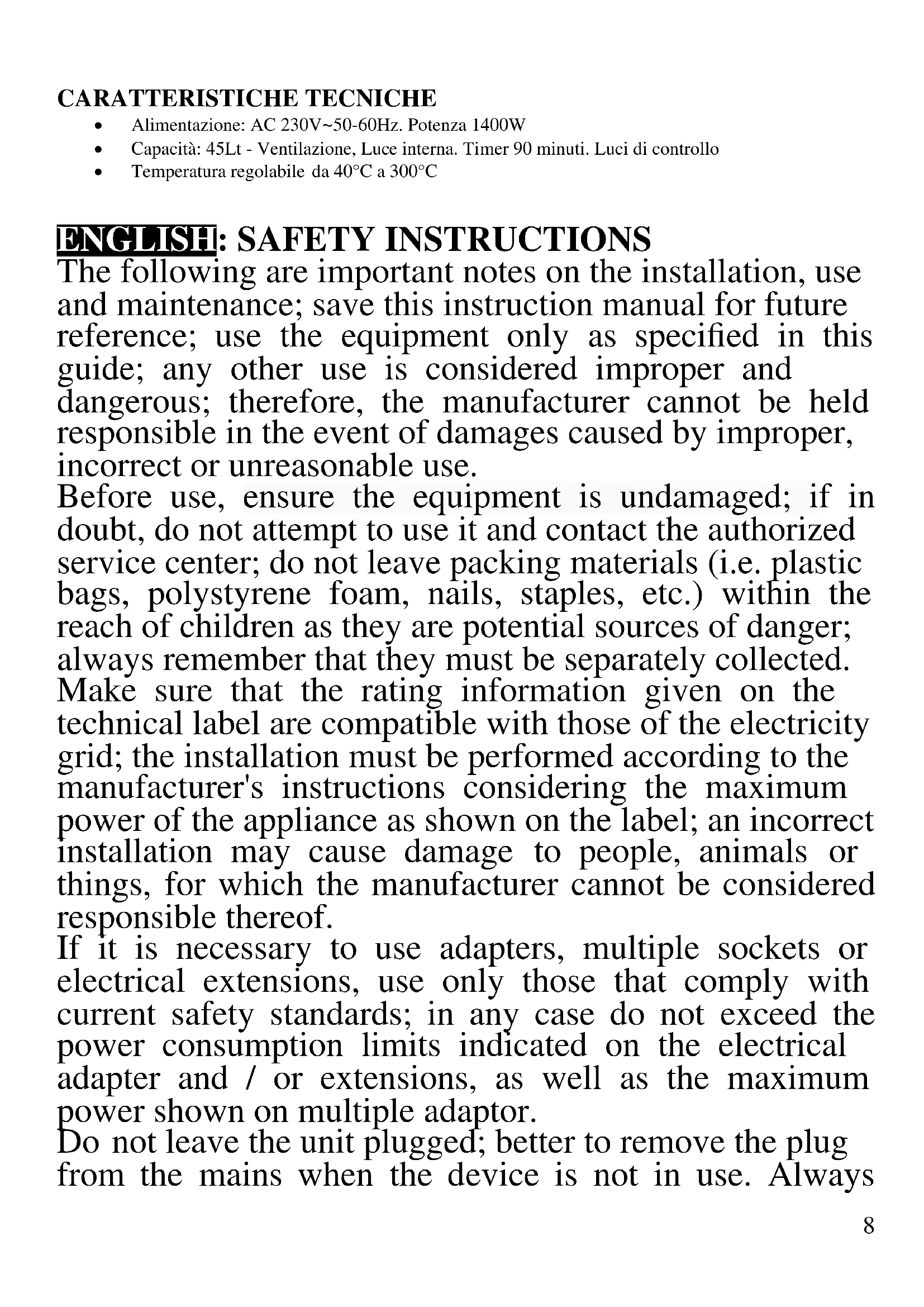The following are important notes on the installation, use and maintenance; save this instruction manual for future reference; use the equipment only as specified in this guide; any other use is considered improper and dangerous; therefore, the manufacturer cannot be held responsible in the event of damages caused by improper, incorrect or unreasonable use. Before use, ensure the equipment is undamaged; if in doubt, do not attempt to use it and contact the authorized service center; do not leave packing materials (i.e. plastic bags, polystyrene foam, nails, staples, etc.) within the reach of children as they are potential sources of danger; always remember that they must be separately collected. Make sure that the rating information given on the technical label are compatible with those of the electricity grid; the installation must be performed according to the manufacturer's instructions considering the maximum power of the appliance as shown on the label; an incorrect installation may cause damage to people, animals or things, for which the manufacturer cannot be considered responsible thereof. If it is necessary to use adapters, multiple sockets or electrical extensions, use only those that comply with current safety standards; in any case do not exceed the power consumption limits indicated on the electrical adapter and / or extensions, as well as the maximum power shown on multiple adaptor. Do not leave the unit plugged; better to remove the plug from the mains when the device is not in use. Always9 disconnect from power supply if you leave it unattended. Cleaning operations should be carried out after unplugging the unit. If the unit is out of order and you do not want to fix it, it must be made inoperable by cutting power cord. - Do not allow the power cord to get closer to sharp objects or in contact with hot surfaces; do not pull it to disconnect the plug. - Do not handle or touch the appliance with wet hands or bare feet. Do not expose the appliance to harmful weather conditions such as rain, moisture, frost, etc.. Always store it in a dry place. - Do not use the appliance in the event of damage to the power cord, plug, or in case of short circuits; to repair the product only address an authorized service center. - This appliance can be used by children of 8 years and above and persons with reduced physical, sensory or mental capabilities or lack of experience and knowledge if they received supervision or instruction concerning use of the appliance in a safe way and understand hazards involved; children shall not play with the appliance; cleaning and user maintenance shall not be made by children without supervision. - Children must not play with the appliance. - Keep the appliance and its cord out of reach of children less than 8 years. If the power cord is damaged, or in case of failure and / or malfunction do not tamper with the unit. The reparation must be done by manufacturer or by service center authorized by the manufacturer in order to prevent any risk. Failure to comply with the above may compromise the unit safety and invalidate the warranty.