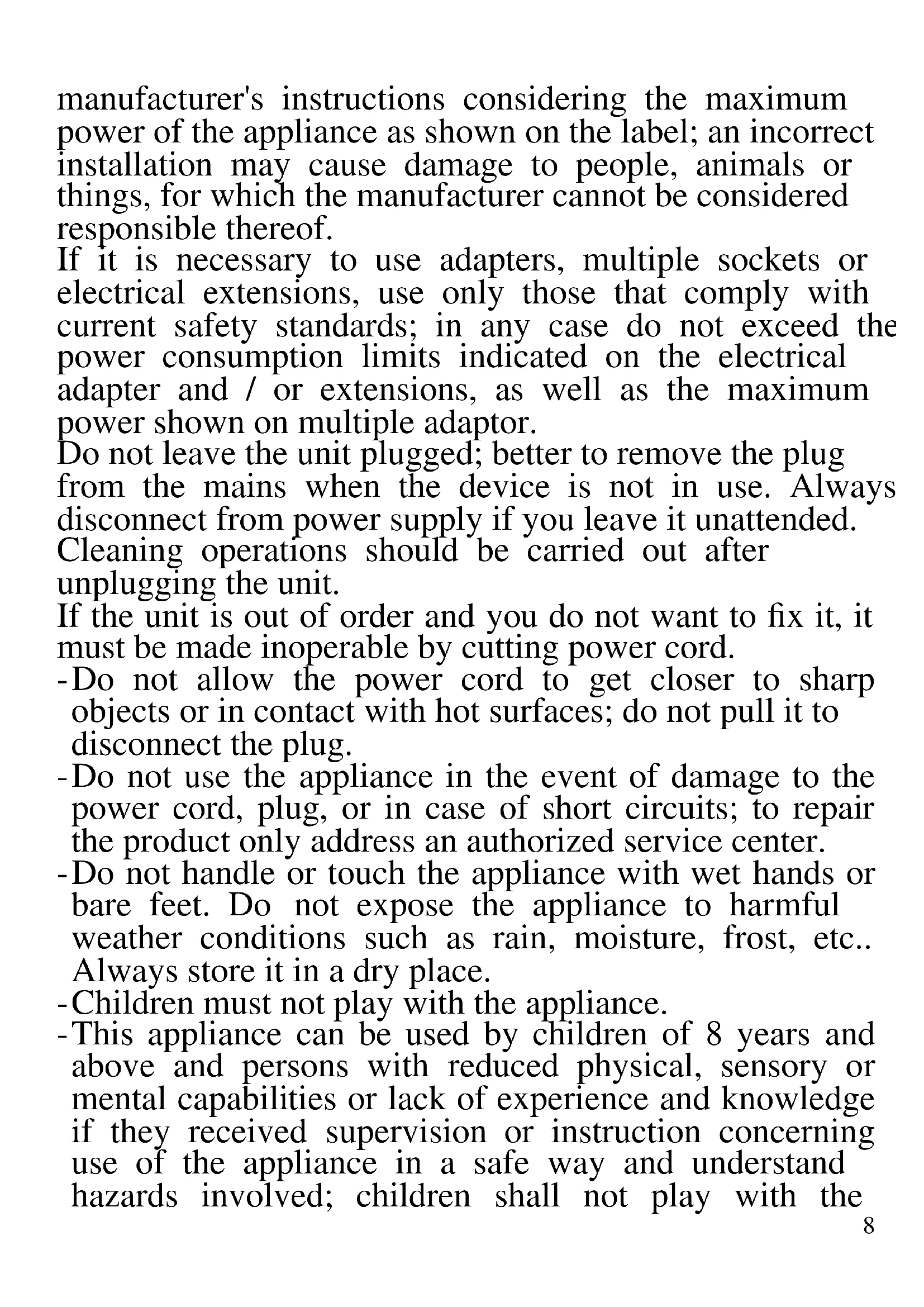 The following are important notes on the installation, use and maintenance; save this instruction manual for future reference; use the equipment only as specified in this guide; any other use is considered improper and dangerous; therefore, the manufacturer cannot be held responsible in the event of damages caused by improper, incorrect or unreasonable use. Before use, ensure the equipment is undamaged; if in doubt, do not attempt to use it and contact the authorized service center; do not leave packing materials (i.e. plastic bags, polystyrene foam, nails, staples, etc.) within the reach of children as they are potential sources of danger; always remember that they must be separately collected. Make sure that the rating information given on the technical label are compatible with those of the electricity grid; the installation must be performed according to the8 manufacturer's instructions considering the maximum power of the appliance as shown on the label; an incorrect installation may cause damage to people, animals or things, for which the manufacturer cannot be considered responsible thereof. If it is necessary to use adapters, multiple sockets or electrical extensions, use only those that comply with current safety standards; in any case do not exceed the power consumption limits indicated on the electrical adapter and / or extensions, as well as the maximum power shown on multiple adaptor. Do not leave the unit plugged; better to remove the plug from the mains when the device is not in use. Always disconnect from power supply if you leave it unattended. Cleaning operations should be carried out after unplugging the unit. If the unit is out of order and you do not want to fix it, it must be made inoperable by cutting power cord. - Do not allow the power cord to get closer to sharp objects or in contact with hot surfaces; do not pull it to disconnect the plug. - Do not use the appliance in the event of damage to the power cord, plug, or in case of short circuits; to repair the product only address an authorized service center. - Do not handle or touch the appliance with wet hands or bare feet. Do not expose the appliance to harmful weather conditions such as rain, moisture, frost, etc.. Always store it in a dry place. - Children must not play with the appliance. - This appliance can be used by children of 8 years and above and persons with reduced physical, sensory or mental capabilities or lack of experience and knowledge if they received supervision or instruction concerning use of the appliance in a safe way and understand hazards involved; children shall not play with the9 appliance; cleaning and user maintenance shall not be made by children without supervision. - Keep the appliance and its cord out of reach of children less than 8 years. If the power cord is damaged, or in case of failure and / or malfunction do not tamper with the unit. The reparation must be done by manufacturer or by service center authorized by the manufacturer in order to prevent any risk. Failure to comply with the above may compromise the unit safety and invalidate the warranty.