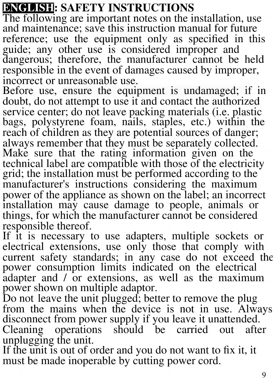 The following are important notes on the installation, use and maintenance; save this instruction manual for future reference; use the equipment only as specified in this guide; any other use is considered improper and dangerous; therefore, the manufacturer cannot be held responsible in the event of damages caused by improper, incorrect or unreasonable use. Before use, ensure the equipment is undamaged; if in doubt, do not attempt to use it and contact the authorized service center; do not leave packing materials (i.e. plastic bags, polystyrene foam, nails, staples, etc.) within the reach of children as they are potential sources of danger; always remember that they must be separately collected. Make sure that the rating information given on the technical label are compatible with those of the electricity grid; the installation must be performed according to the manufacturer's instructions considering the maximum power of the appliance as shown on the label; an incorrect installation may cause damage to people, animals or things, for which the manufacturer cannot be considered responsible thereof. If it is necessary to use adapters, multiple sockets or electrical extensions, use only those that comply with current safety standards; in any case do not exceed the power consumption limits indicated on the electrical adapter and / or extensions, as well as the maximum power shown on multiple adaptor. Do not leave the unit plugged; better to remove the plug from the mains when the device is not in use. Always disconnect from power supply if you leave it unattended. Cleaning operations should be carried out after unplugging the unit. If the unit is out of order and you do not want to fix it, it must be made inoperable by cutting power cord.10 - Do not allow the power cord to get closer to sharp objects or in contact with hot surfaces; do not pull it to disconnect the plug. - Do not use the appliance in the event of damage to the power cord, plug, or in case of short circuits; to repair the product only address an authorized service center. - Do not handle or touch the appliance with wet hands or bare feet. Do not expose the appliance to harmful weather conditions such as rain, moisture, frost, etc.. Always store it in a dry place. - This appliance can be used by children of 8 years and above and persons with reduced physical, sensory or mental capabilities or lack of experience and knowledge if they received supervision or instruction concerning use of the appliance in a safe way and understand hazards involved; children shall not play with the appliance; cleaning and user maintenance shall not be made by children without supervision. - Children must not play with the appliance. - Keep the appliance and its cord out of reach of children less than 8 years. If the power cord is damaged, or in case of failure and / or malfunction do not tamper with the unit. The reparation must be done by manufacturer or by service center authorized by the manufacturer in order to prevent any risk. Failure to comply with the above may compromise the unit safety and invalidate the warranty.
