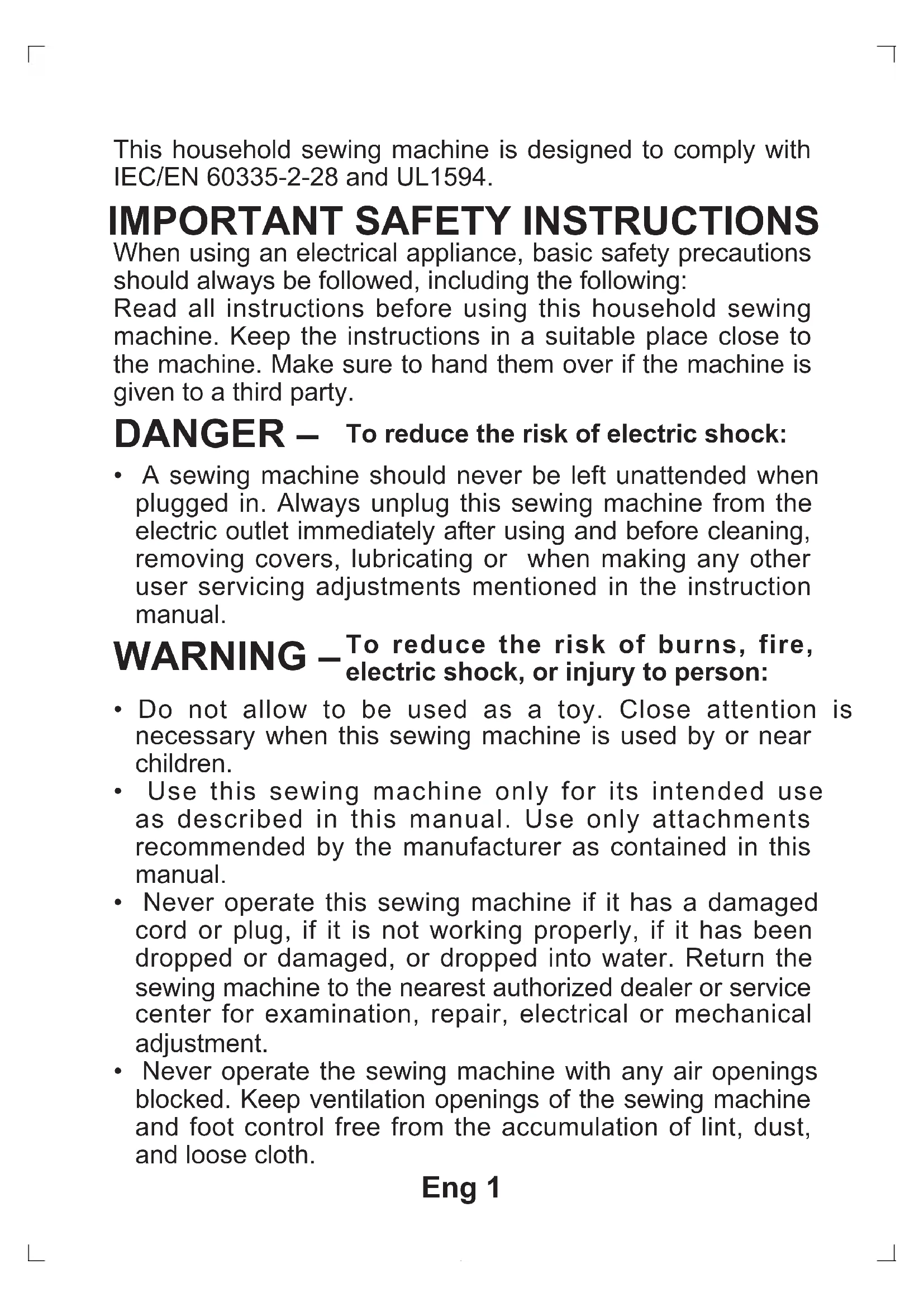 F-1 5500/5400 6199/6180/6160F-2 Eng 1 This household sewing machine is designed to comply with IEC/EN 60335-2-28 and UL1594. When using an electrical appliance, basic safety precautions should always be followed, including the following: Read all instructions before using this household sewing machine. Keep the instructions in a suitable place close to the machine. Make sure to hand them over if the machine is given to a third party.