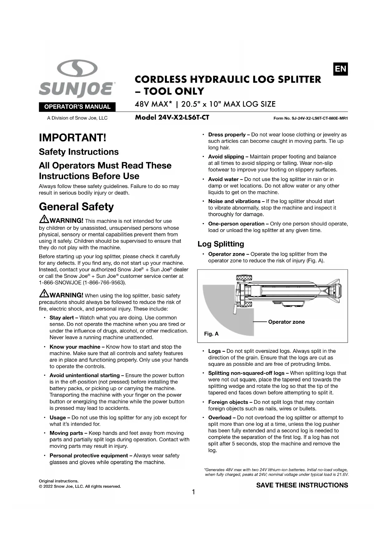 24V-X2-LS6T-CT - Log splitter Sun Joe - Free user manual and instructions