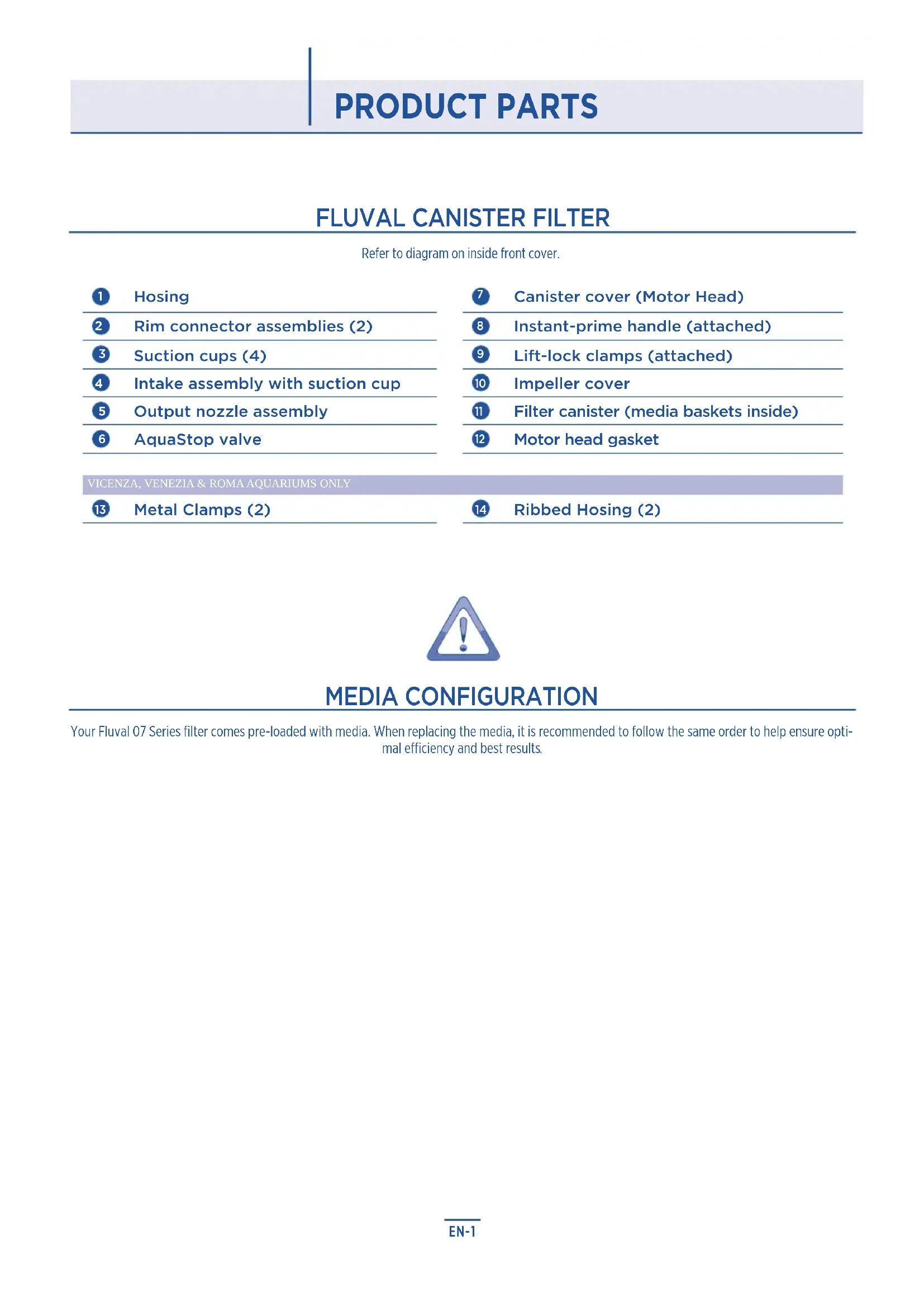 Ribbed Hosing (2) MEDIA CONFIGURATION Your Fluval 07 Series filter comes pre-loaded with media. When replacing the media, it is recommended to follow the same order to help ensure opti- mal efficiency and best results