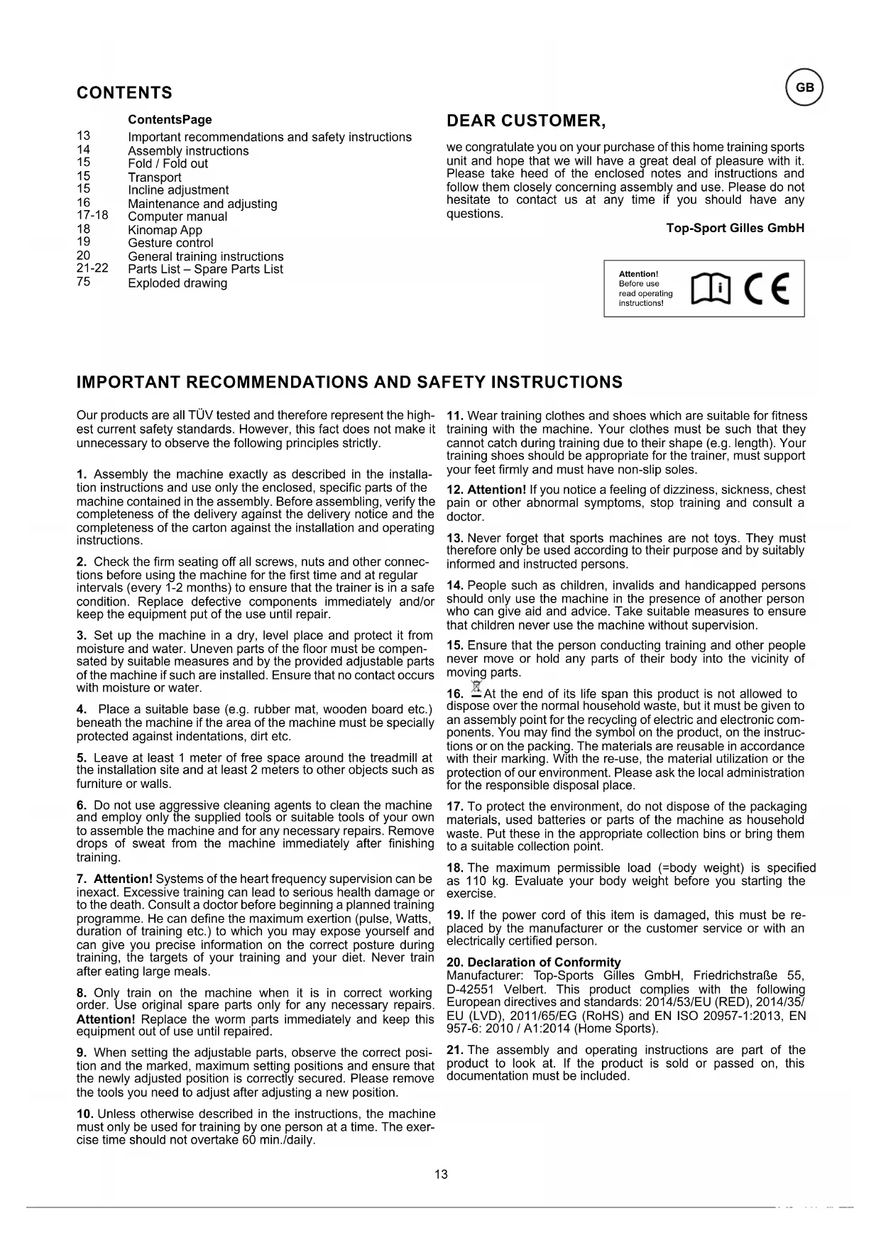 CONTENTS DEAR CUSTOMER, we congratulate you on your purchase of this home training sports unit and hope that we will have a great deal of pleasure with it. Please take heed of the enclosed notes and instructions and follow them closely concerning assembly and use. Please do not hesitate to contact us at any time if you should have any questions. Top-Sport Gilles GmbH ContentsPage Attention! Before use read operating instructions!
