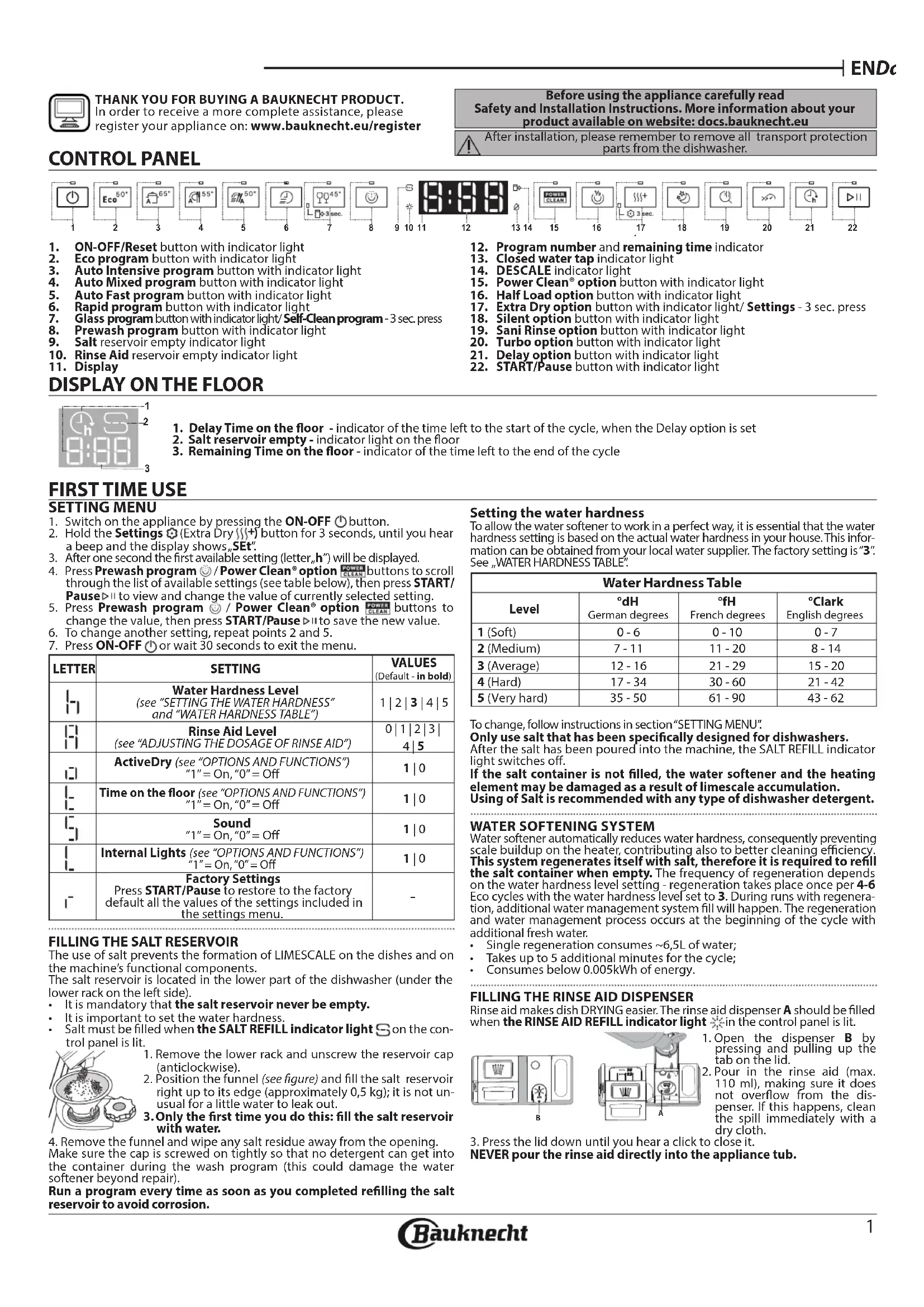 Before using the appliance carefully read Safety and Installation Instructions. More information about your product available on website: docs.bauknecht.eu After installation, please remember to remove all transport protection parts from the dishwasher. CONTROL PANEL