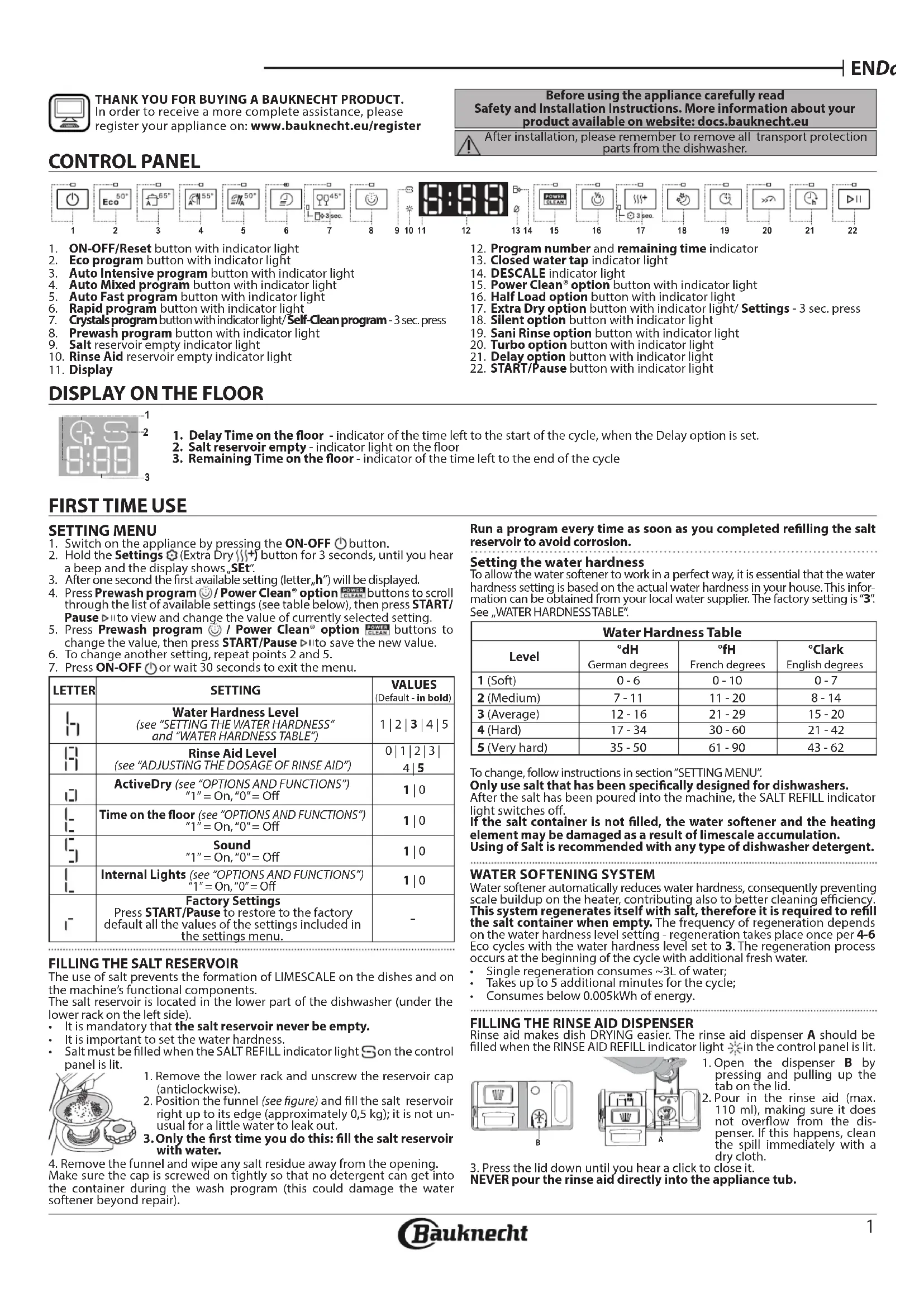 Before using the appliance carefully read Safety and Installation Instructions. More information about your product available on website: docs.bauknecht.eu After installation, please remember to remove all transport protection parts from the dishwasher. CONTROL PANEL
