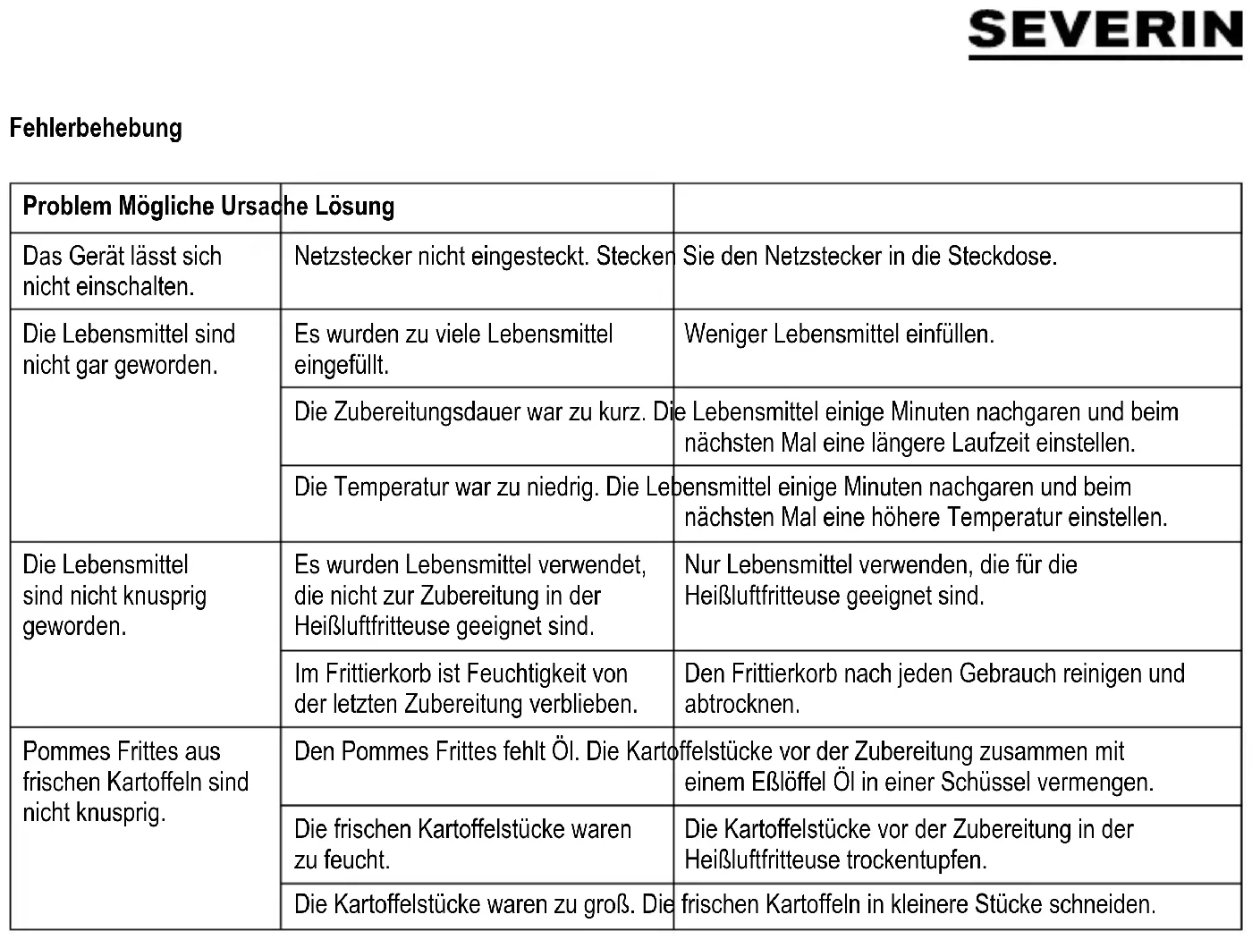 programmes, steps 4-9.14 142 x 208 mm Useful hints for air-frying ∙ You can prepare your food using the basic automatic programme settings, or adjust the settings according to your own requirements. ∙ Note that the cooking times listed are only approximate. Depending on the type of food, the cooking times and temperatures may have to be adjusted. ∙ With larger quantities, the cooking time increases. We recommend frequent turning of the food. Tip! When preparing frozen pizza, the pizza must be turned halfway through to ensure even cooking. ∙ If the food turns out too dark, try lowering the temperature rst, before shortening the cooking times. ∙ For nutritious, healthy deep-frying we recommend to use a temperature setting of no higher than 170 °C when deep-frying amylaceous food, i.e. food with a higher-than-average starch content. With the reduced frying temperature, and with an equally reduced amount of food in the frying basket, the build-up of substances detrimental to health is limited to a minimum. Cleaning and care ∙ Before cleaning, always unplug the appliance and allow the low fat fryer to cool down thoroughly. ∙ Caution: To avoid the risk of electric shock, do not clean the outside of the fryer or its power cord with any liquids and do not immerse either of them in water. ∙ Do not use sharp or abrasive cleaning agents to avoid scratching the housing and the non-stick coating on the frying basket and drip tray. ∙ Clean all removable inserts in the rinsing water and dry thoroughly or clean in the dishwasher. ∙ Wipe the housing and the cooking chamber with a damp cloth. Removing the door door ∙ The appliance door can be removed for easier cleaning. ∙ To do this, open the door. ∙ Slide the slider on the door hinge (OPEN) to the left and remove the door upwards. ∙ Wipe the door with a damp cloth. Do not immerse in water! ∙ Replace the dry door. ∙ The unit cannot be switched on without the door. Disposal Devices marked with this symbol must be disposed of separately from your household waste, as they contain valuable materials which can be recycled. Proper disposal protects the environment and human health. Your local authority or retailer can provide information on the matter. Troubleshooting Problem Possible cause Solution The appliance will not switch on. The appliance is not plugged in. Insert the mains plug into the socket. The food has not become cooked. Too much food was lled in. Fill in less food. The preparation time was too short. Re-cook the food for a few minutes and set a longer run time next time. The temperature was too low. Cook the food for a few minutes and set a higher temperature the next time. The food did not get crispy. Food was used that is not suitable for preparation in the low fat fryer. Only use food that is suitable for the low fat fryer. Moisture from the last preparation has remained in the frying basket. Clean and dry the frying basket after each use. Chips made from fresh potatoes are not crispy. The chips lack oil. Mix the potato pieces together with a tablespoon of oil in a bowl before cooking. The fresh potato pieces were too moist. Pat the potato pieces dry before cooking in the low fat fryer. The potato pieces were too big. Cut the fresh potatoes into smaller pieces.15 142 x 208 mm Friteuse sans huile Chère cliente, Cher client, Avant d’utiliser cet appareil, veuillez lire soigneusement les instructions suivantes et conserver ce manuel pour future référence. L’appareil doit être utilisé exclusivement par des personnes familiarisées avec les présentes instructions. Branchement au secteur Cet appareil doit être branché sur une prise de terre installée selon les normes en vigueur. S’assurer que la tension d’alimentation correspond à la tension indiquée sur la che signalétique de l’appareil. Ce produit est conforme à toutes les directives relatives au marquage “CE”. Familiarisez-vous avec votre appareil