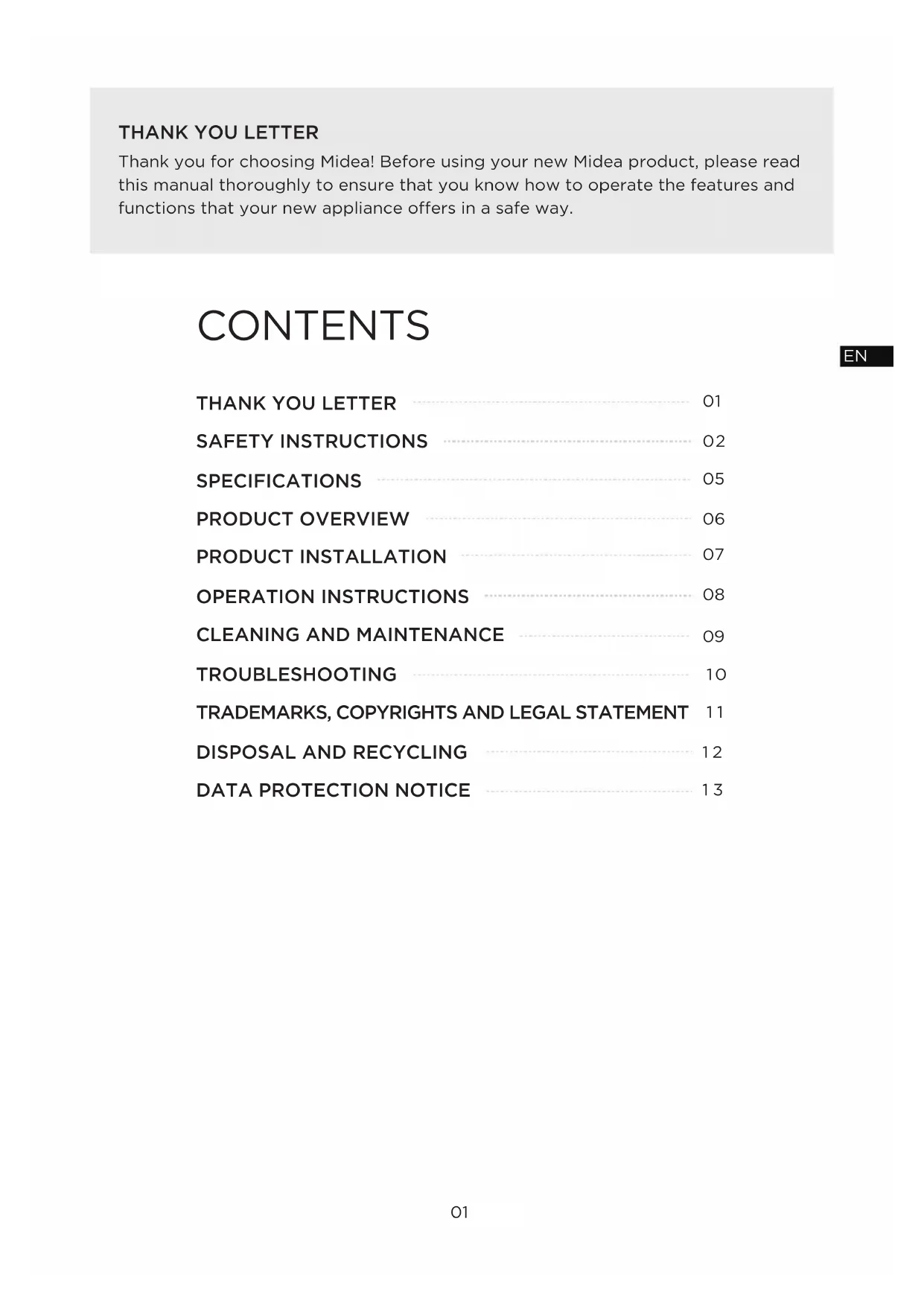 Thank you for choosing Midea! Before using your new Midea product, please read this manual thoroughly to ensure that you know how to operate the features and functions that your new appliance offers in a safe way. CONTENTS