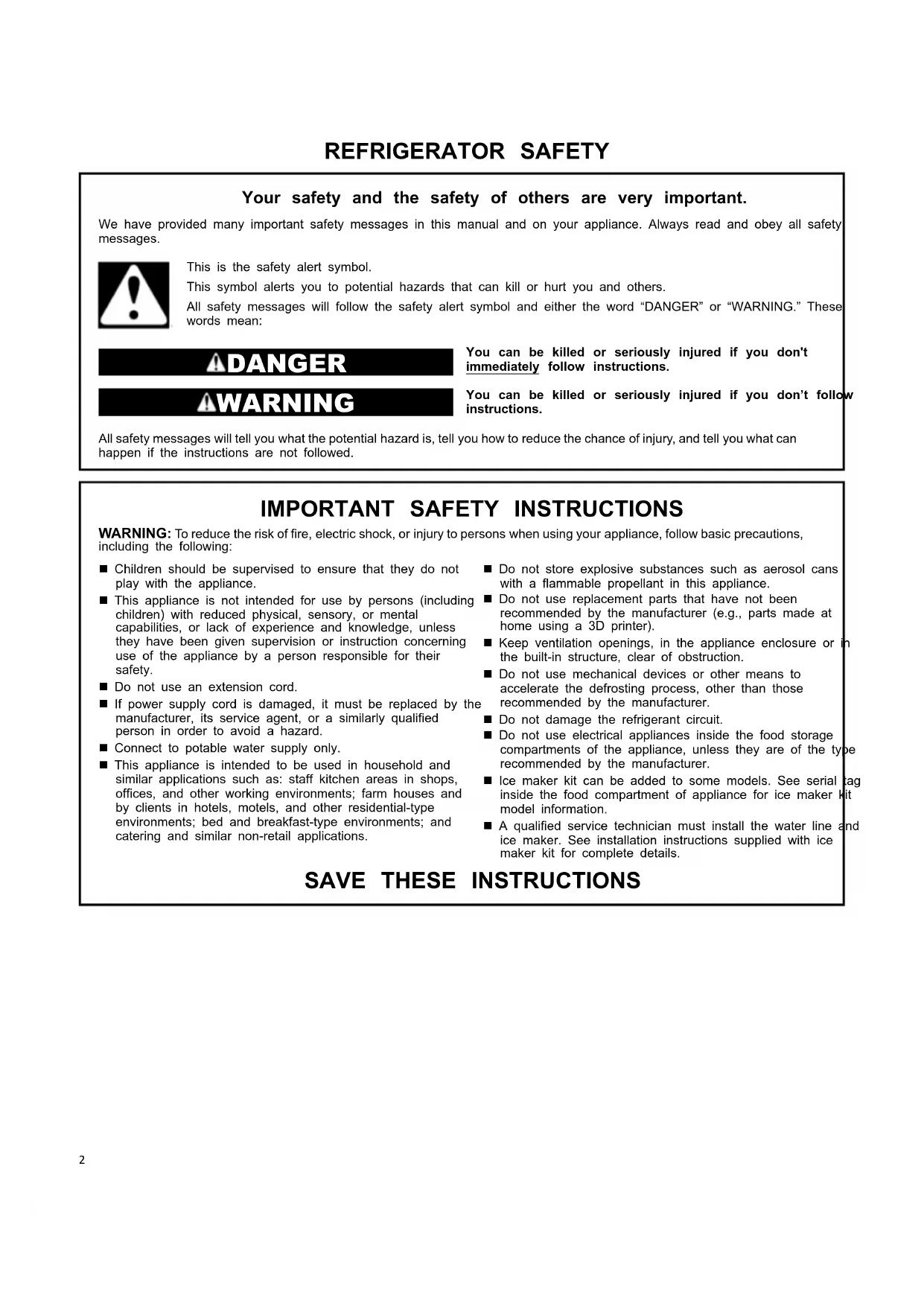 REFRIGERATOR SAFETY Your safety and the safety of others are very important. We have provided many important safety messages in this manual and on your appliance. Always read and obey all safety messages. This is the safety alert symbol. This symbol alerts you to potential hazards that can kill or hurt you and others. All safety messages will follow the safety alert symbol and either the word “DANGER” or “WARNING.” These words mean: DANGER You can be killed or seriously injured if you don't immediately follow instructions. WARNING You can be killed or seriously injured if you don’t follow instructions. All safety messages will tell you what the potential hazard is, tell you how to reduce the chance of injury, and tell you what can happen if the instructions are not followed.