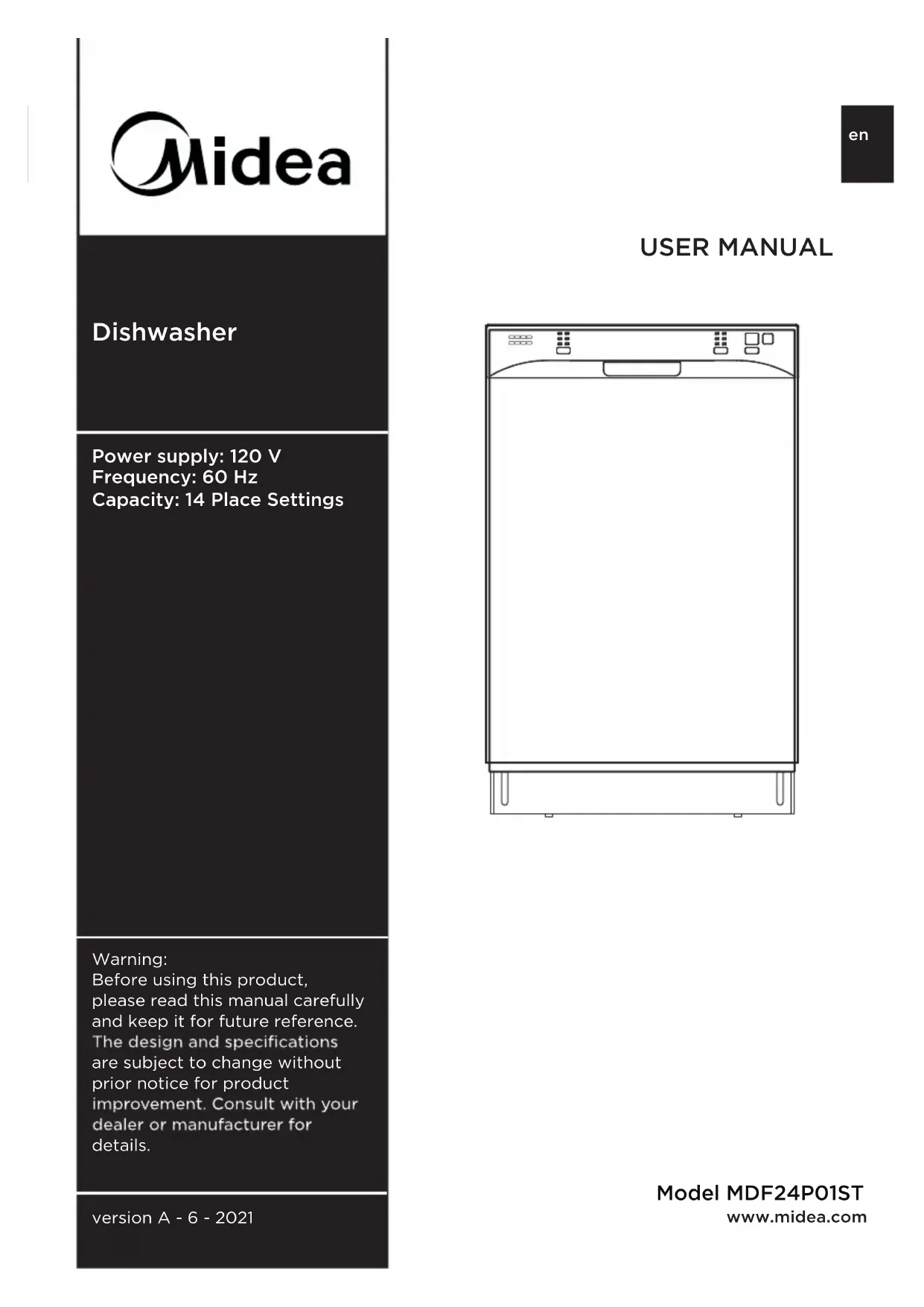 Before using this product, please read this manual carefully and keep it for future reference. are subject to change without prior notice for product details. Power supply: 120 V Frequency: 60 Hz Capacity: 14 Place Settings Model MDF24P01STDear user Thank you for letting Midea help you "make yourself at home." This manual is part of our commitment to your total satisfaction. Please read this manual carefully before use and keep it in a convenient place for future reference. To help us serve you better, please consider registering your product using our convenient Midea app MSmartlife, by visiting HYPERLINK http://www.midea.com, or by texting a picture of your proof of purchase to 1-866-646-4332 . s.........................................................8-10 ........................................................ 2-3Important Safety Instructions ... Dishwasher Features ........................................................................ 4 Operating Instructions ..................................................................... -75 Preparing and Loading Dishe Dishwasher Dispenser and Detergents ...............................................11 Warranty........................................................................................17 Solutions to Common Dishwashing Problems.................................15-16 Care and Cleaning ......................................................................12-142