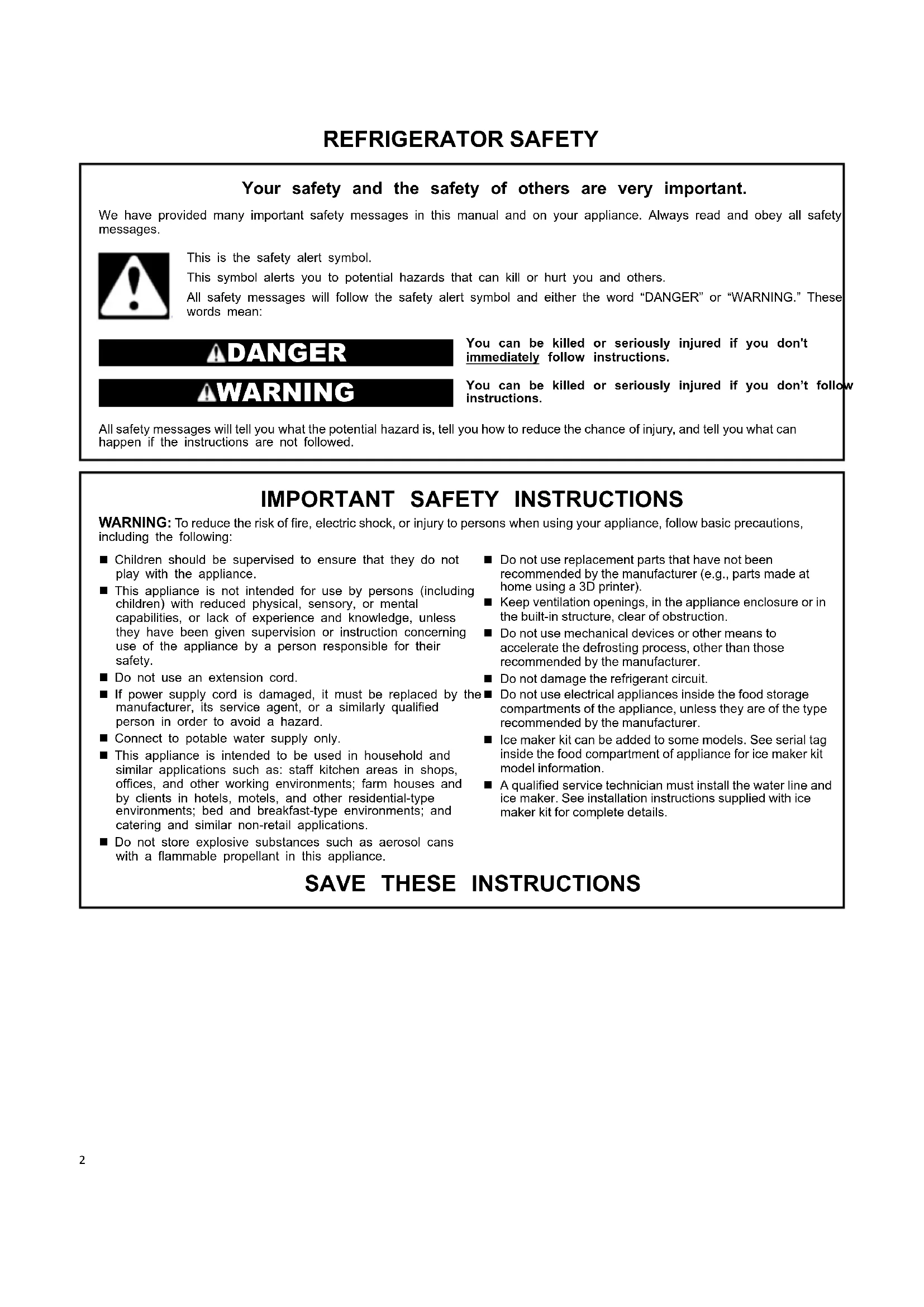 REFRIGERATOR SAFETY Your safety and the safety of others are very important. We have provided many important safety messages in this manual and on your appliance. Always read and obey all safetymessages.This is the safety alert symbol.This symbol alerts you to potential hazards that can kill or hurt you and others.All safety messages will follow the safety alert symbol and either the word “DANGER” or “WARNING.” Thesewords mean: DANGER You can be killed or seriously injured if you don'timmediately follow instructions. WARNING You can be killed or seriously injured if you don’t followinstructions. All safety messages will tell you what the potential hazard is, tell you how to reduce the chance of injury, and tell you what can happen if the instructions are not followed.
