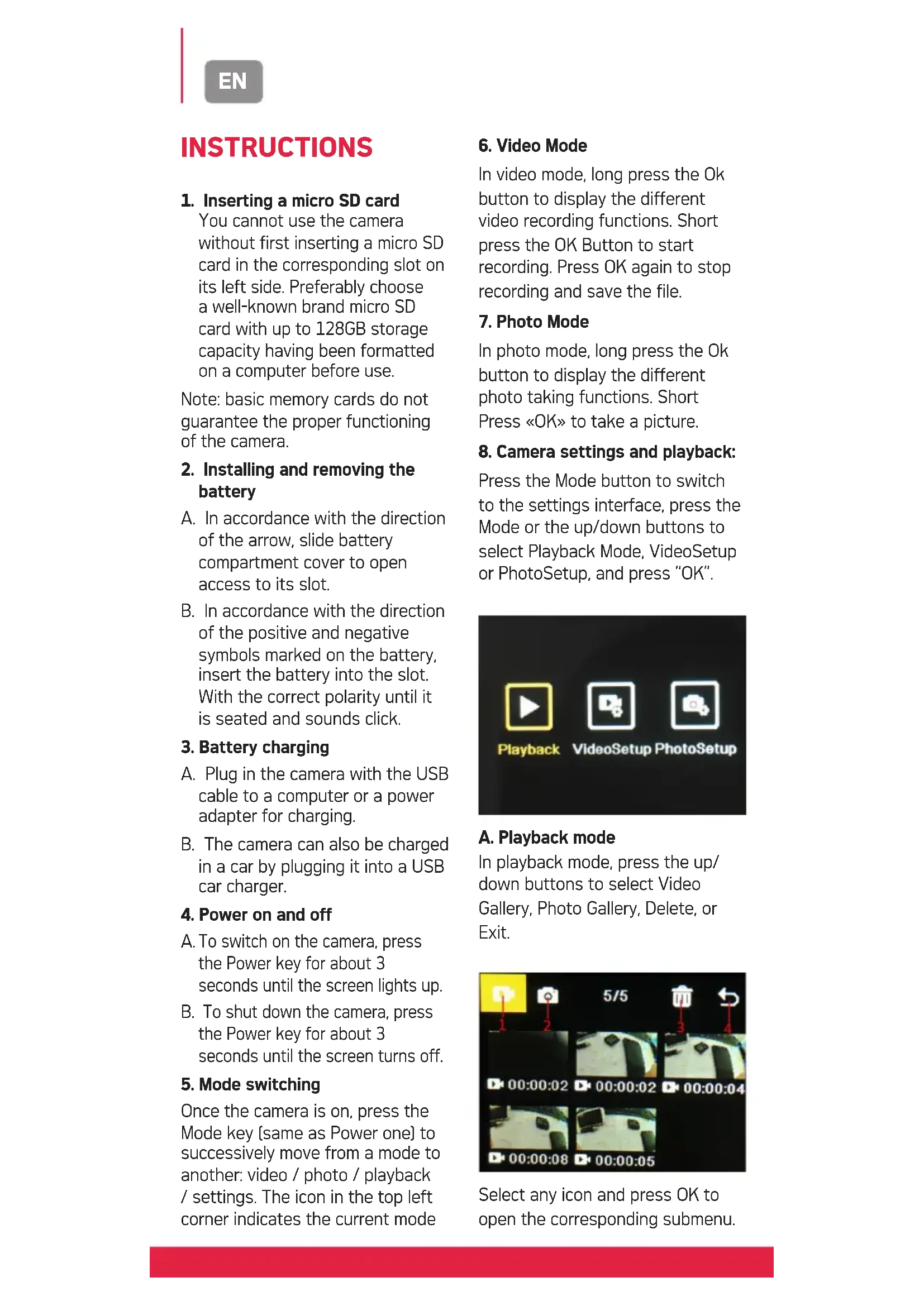 Press the Mode button to switch to the settings interface, press the Mode or the up/down buttons to select Playback Mode, VideoSetup or PhotoSetup, and press “OK”. A. Playback mode In playback mode, press the up/ down buttons to select Video Gallery, Photo Gallery, Delete, or Exit. Select any icon and press OK to open the corresponding submenu.EN