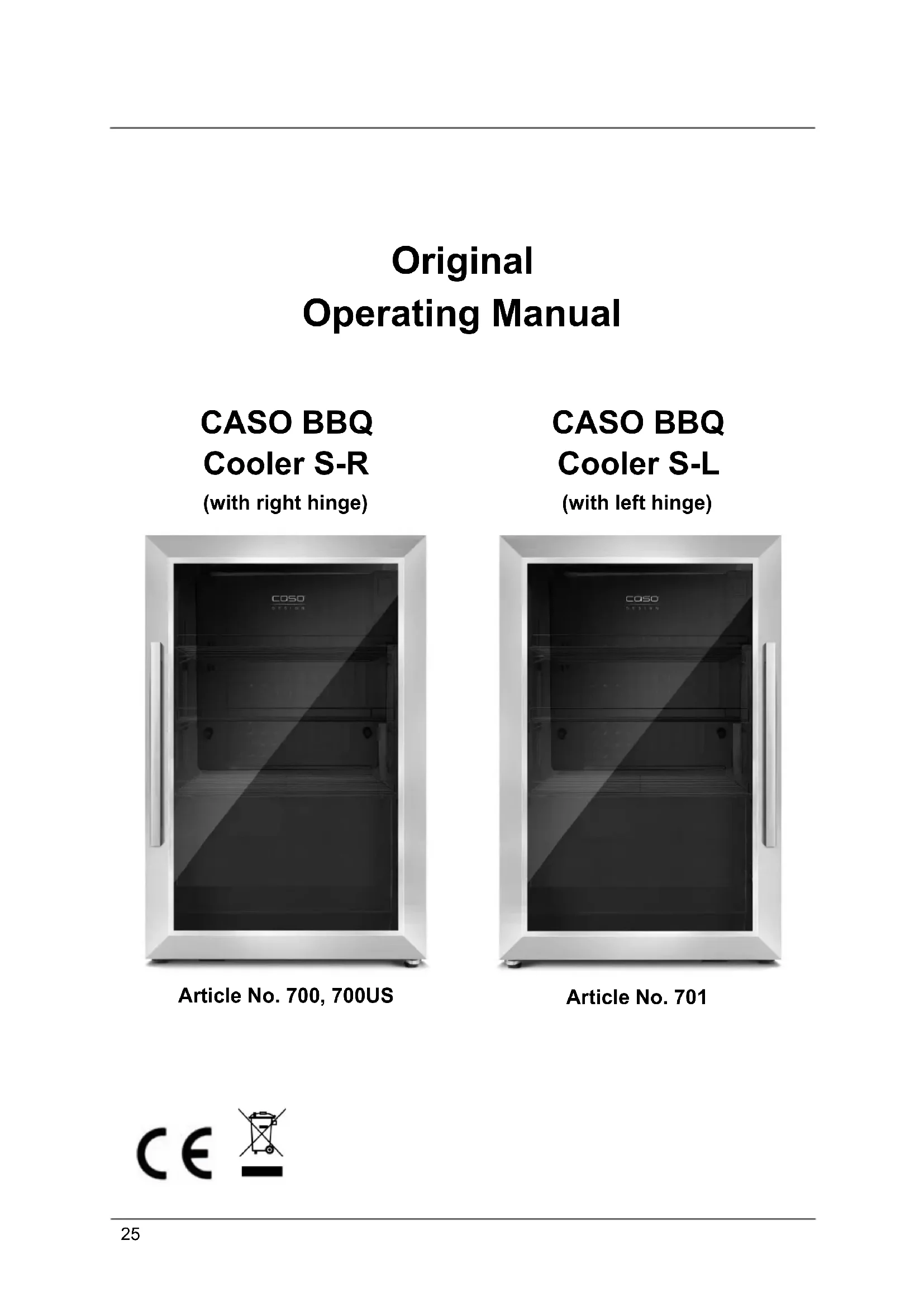 Compressor will not start The compressor will not start if the ambient temperature is lower than the desired temperature. Dew on the surface of cabinet: Dew may form on the glass front, especially if the appliance is placed in a humid environment.Please wipe it away with dry cloth. Liquid sound The sound of compressor when starts or stops working37 Please note ► If you are unable to solve the problem with the steps shown above, please contact Customer Service. 18 Disposal of the Old Device Old electric and electronic devices frequently still contain valuable materials. However, they also contain damaging substances, which were necessary for their functionality and safety. If these were put in the non-recyclable waste or were handled incorrectly, they could be detrimental to human health and the environment. Therefore, do not put your old device into the non-recyclable waste under any circumstances. Please note ► Utilise the collection point, established in your town, to return and recycle old electric and electronic devices. If necessary, contact your town hall, local refuse collection service or your dealer for information. ► Ensure that your old device is stored safely away from children until it is taken away: Before you throw away your old refrigerator take off the doors and leave the shelves in place, so that children may not easily climb insid ► Blowing gas inside the unit is flammable. The disposal of this flammable material should be in accordance with national regulations. 19 Guarantee We provide a 24-month guarantee for defects caused by production or material faults, beginning on the date of purchase. Our guarantee is valid for Germany, Austria and the Netherlands. For all other countries, please contact us. Your legal guarantee claims as per Art. 437 ff. German Civil Code (BGB) will remain unaffected by this. You may exercise your statutory guarantee rights free of charge. The guarantee does not cover damage caused by improper handling or use of the product or defects which have only a minor impact on the product’s functionality or value. In addition to this, the guarantee also excludes parts which are subject to wear and tear; transport damages insofar as we are not responsible for them and damages caused by repairs which were not carried out by us. This product is designed and rated for commercial and domestic (household) use In the case of legitimate complaints we may either repair the defective product or replace it with a defect-free product at our discretion.Obvious defects must be notified to us within 14 days of the product’s delivery. Any further claims are excluded. When making a guarantee claim please contact us before you return the product (always with the purchase receipt!). Our contact details (“Guarantor”) are provided at the beginning of this instruction manual.38 20 Technical Data Name CASO BBQ Cooler S-R (with right hinge) Article No. 700 CASO BBQ Cooler S-L (with left hinge) Article No. 701 Average daily energy consumption 0.945 kW.h/24h Connection 220 V – 240 V; 50 Hz; 0,4 A Outside dimensions (W/H/D) 430 x 675 x 505 mm Climate class ST Capacity 63 L Weight 32,1 kg Foreign body / Splash water protection: IPX4 Name CASO BBQ Cooler S-R (with right hinge) Article No. 700US Average daily energy consumption 0.945 kW.h/24h Connection 115 V ~; 60 Hz Outside dimensions (W/H/D) 430 x 675 x 505 mm Climate class ST Capacity 63 L Weight 32,1 kg Foreign body / Splash water protection: IPX439