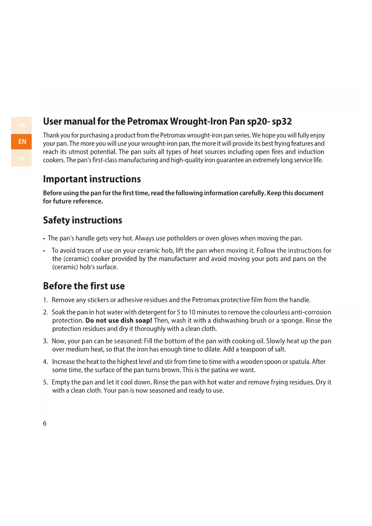 FR6 User manual for the Petromax Wrought-Iron Pan sp20- sp32 Thank you for purchasing a product from the Petromax wrought-iron pan series. We hope you will fully enjoy your pan. The more you will use your wrought-iron pan, the more it will provide its best frying features and reach its utmost potential. The pan suits all types of heat sources including open fires and induction cookers. The pan‘s first-class manufacturing and high-quality iron guarantee an extremely long service life. Important instructions Before using the pan for the first time, read the following information carefully. Keep this document for future reference. Safety instructions