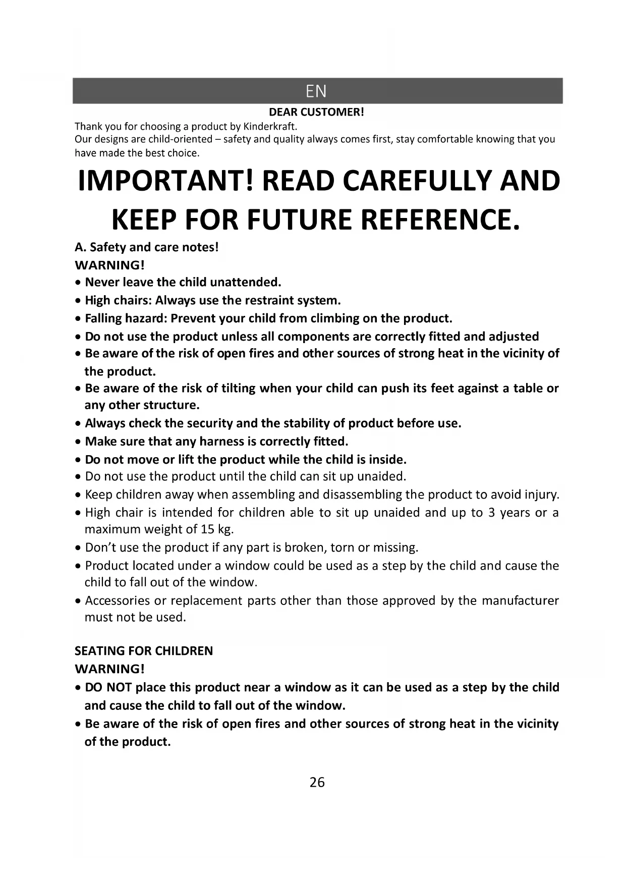 DEARيCUSTOMER! Thank you for choosing a product by Kinderkraft. Our designs are child-oriented – safety and quality always comes first, stay comfortable knowing that you have made the best choice.
