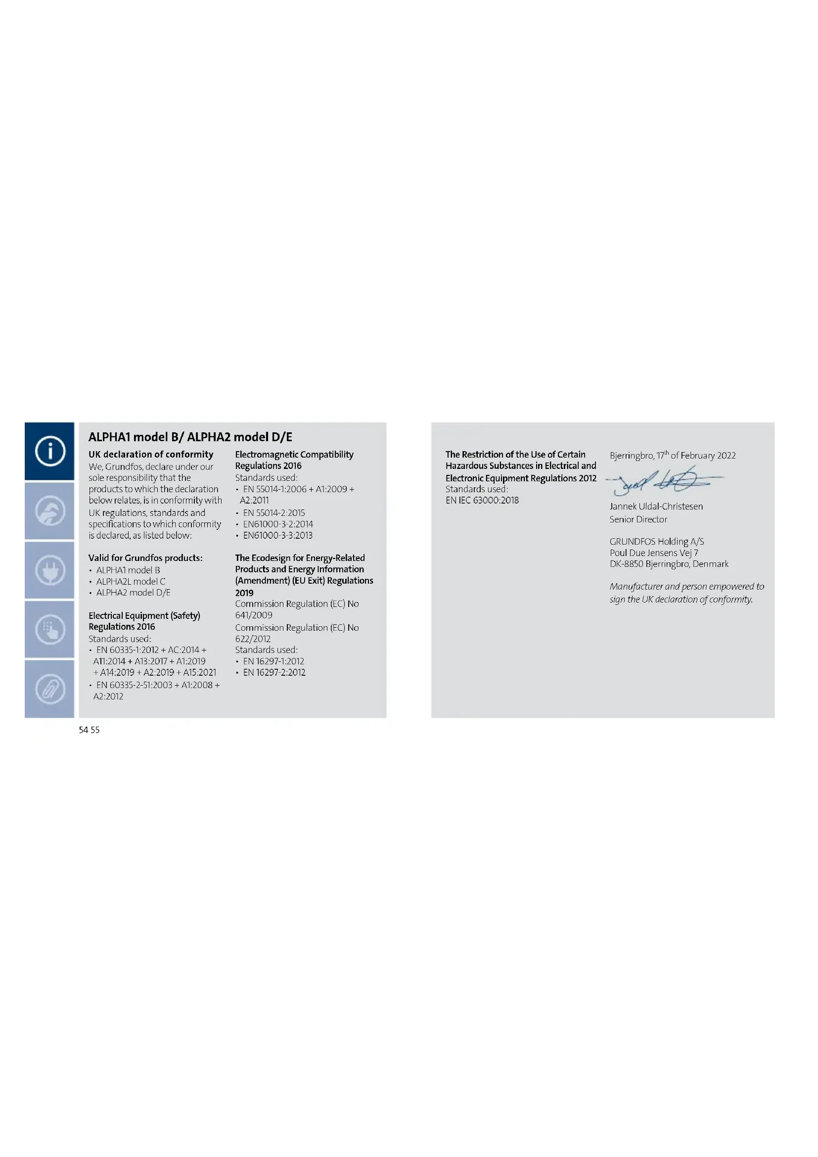 - EN IEC 63000:2018 Bjerringbro, 17 February 2022 Jannik Uldal-Christesen Senior Director GRUNDFOS Holding A/S, Poul Due Jensens Vej 7, 8850 Bjerringbro, Denmark Person authorised to compile technical file and empowered to sign the EC declaration of conformity.54 55 UK declaration of conformity We, Grundfos, declare under our sole responsibility that the products to which the declaration below relates, is in conformity with UK regulations, standards and specifications to which conformity is declared, as listed below: Valid for Grundfos products: