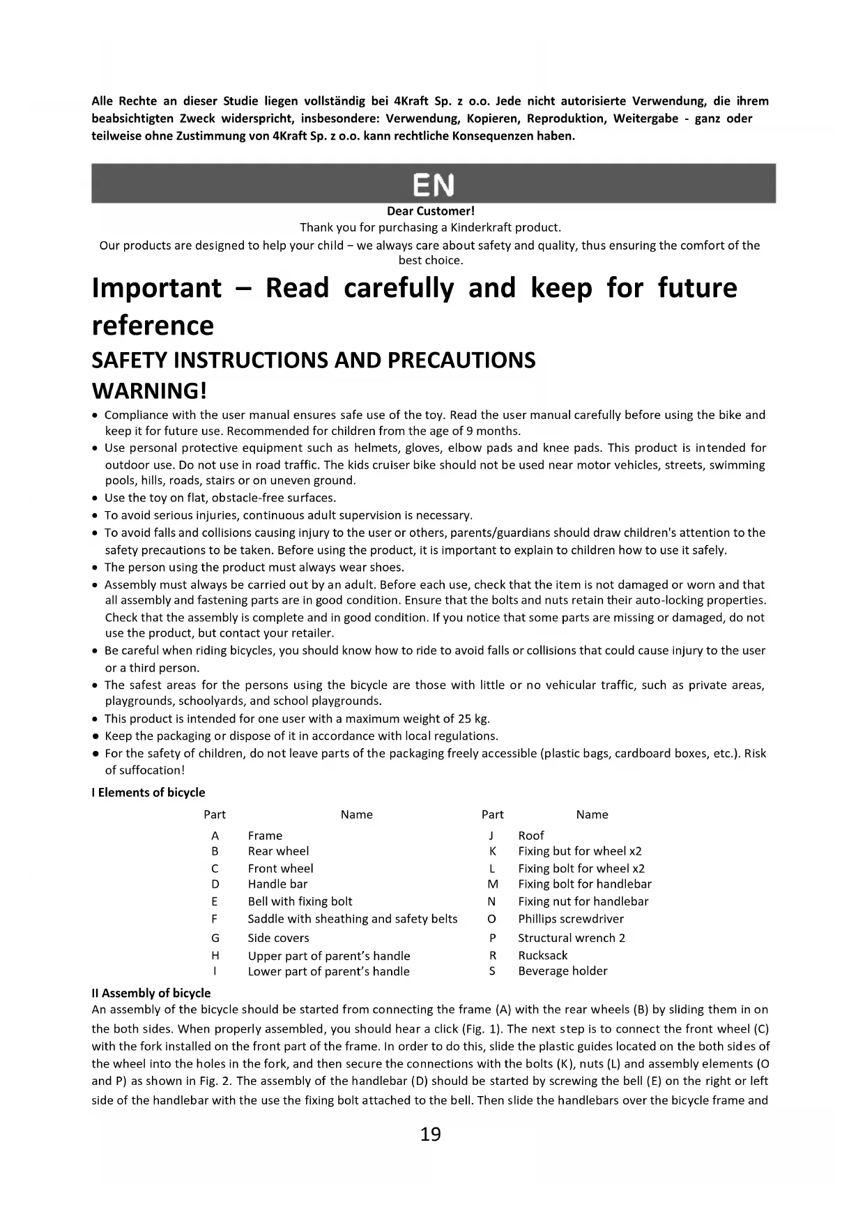 - This product is intended for one user with a maximum weight of 25 kg. ● Keep the packaging or dispose of it in accordance with local regulations. ● For the safety of children, do not leave parts of the packaging freely accessible (plastic bags, cardboard boxes, etc.). Risk of suffocation! I Elements of bicycle Part Name Part Name