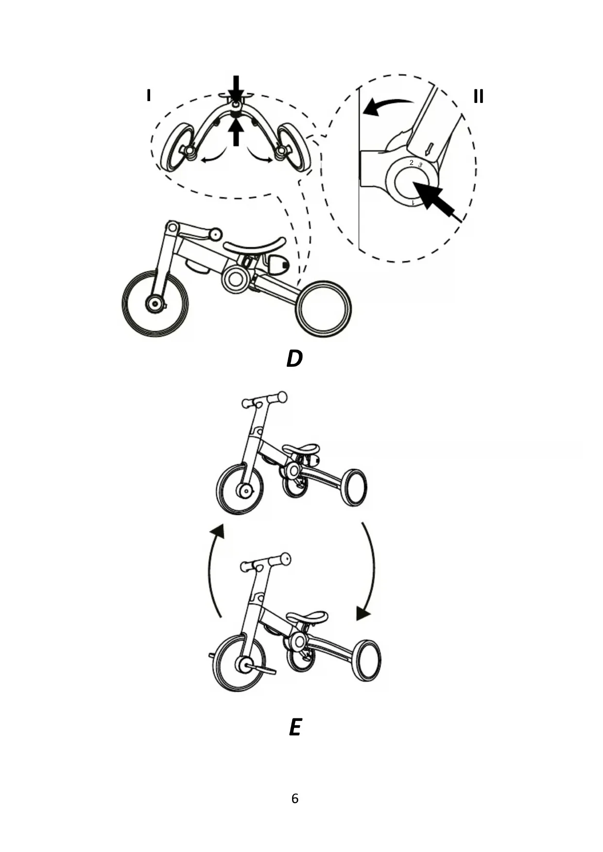 II Mounting the bike Start mounting the bike by inserting the seat (2.) in the frame (1.). Slide the tube into the hole as shown in Figure A. Once correctly installed, you will hear a characteristic click. Then grip the front fork and lift it up. With the fork up, press the button on both sides of the frame (Fig. B). The frame will lock. To unfold the steering wheel, press the buttons at the same time (Fig. C.I) and lift it up until it locks. The bike can have one of three functions: a tricycle, a tricycle with ped als and a balance bike. To transform it into a tricycle, press the upper and lower buttons (Fig. D.I), and unfold the frame as much as possible, with setting the rear wheels in the position marked with number 3 (Fig. D.II). It is possible to install pedals for older children (Fig. E). Remove the pedals by pressing the buttons (Fig. F.I) underneath the seat, hold the lock open and place the pedals on both sides of the front wheel (Fig.F.II). Once properly positioned, the pedals will lock. The pedals can be locked in two positions. The first position makes it impossible to drive the bike with pedals and is undesirable (Fig.G.I) while the second position is correct (Fig.G.II). Leave the rear wheels in the position marked with number 3. To transform the bike from a tricycle to a balance bike (Fig.H), start by moving the wheels to the position marked with number 1 by pressing the button (Fig.I.I). Then use the buttons (Fig.I.II) to fold the rear axle until the rear wheels are folded. Remove the metal connector (5.) (Fig.I.III) from underneath the frame by pulling, and insert it into the holes on the rear axle (Fig.I.IV). If the pedals are mounted, remove them from the front wheel by pressing the button (Fig.I.V) and place them back under the seat (Fig.I.VI). It is possible to change the seat tube (3.) to a longer one; to do so, unscrew the screw that holds the seat tube with the mounting spanner (4.) and pull the tube out of the hole. Then insert the longer tube so that the holes in the tube and seat overlap. Tighten the screw with the mounting spanner. NOTE: The bike can be used in two rear wheel alignment configurations. Position 1 - balance bike (Fig. J.I), Position 3 - tricycle (Fig. J.II). Do not use the bike in position 2. Position 2 is used to adjust the wheels during storage and transport (Fig. J.III).