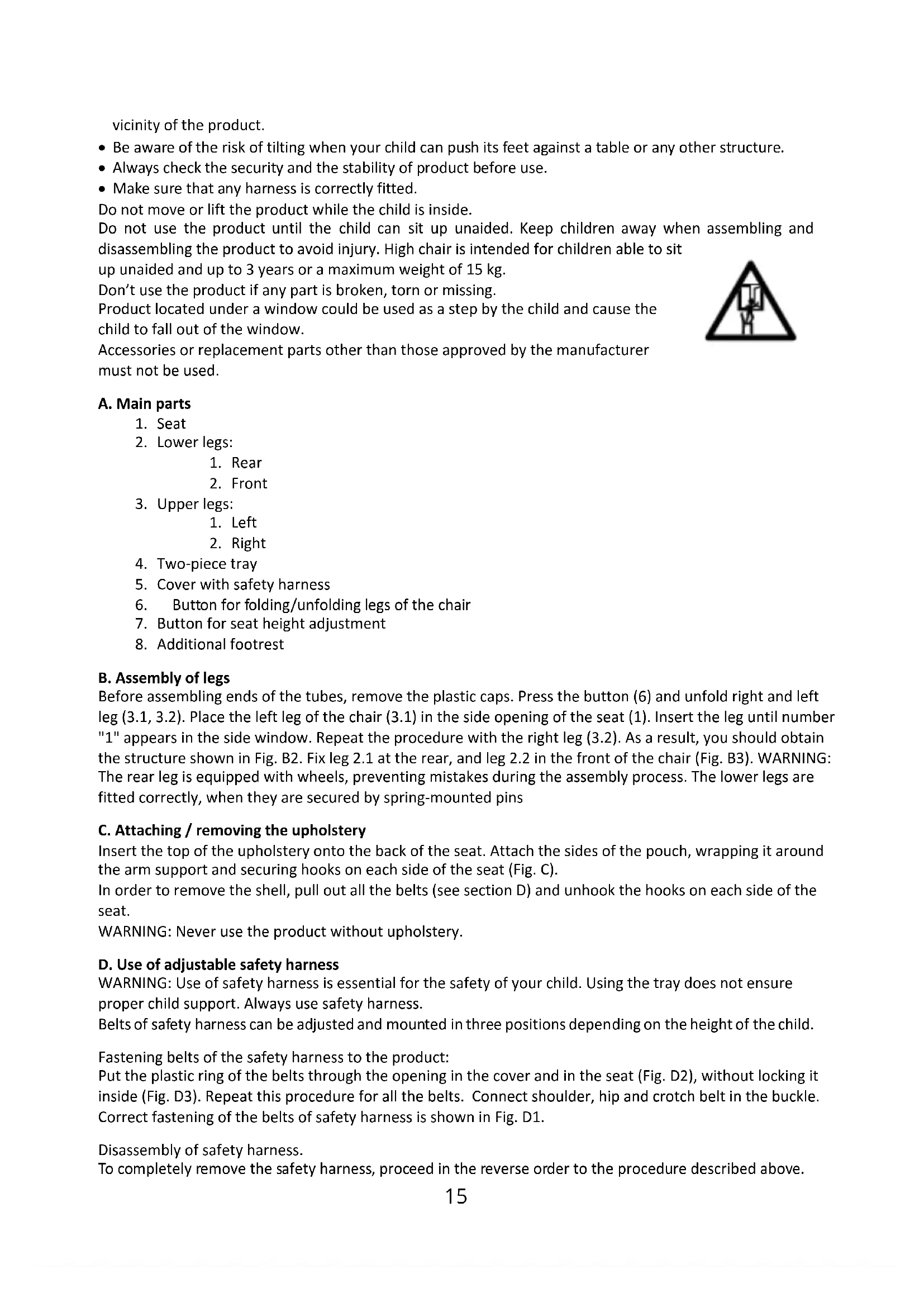 - Make sure that any harness is correctly fitted. Do not move or lift the product while the child is inside. Do not use the product until the child can sit up unaided. Keep children away when assembling and disassembling the product to avoid injury. High chair is intended for children able to sit up unaided and up to 3 years or a maximum weight of 15 kg. Don’t use the product if any part is broken, torn or missing. Product located under a window could be used as a step by the child and cause the child to fall out of the window. Accessories or replacement parts other than those approved by the manufacturer must not be used. A. Main parts
