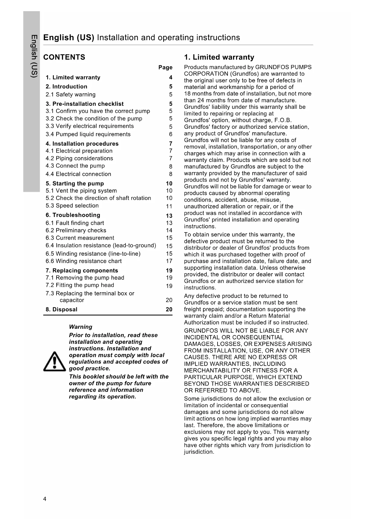 Products manufactured by GRUNDFOS PUMPS CORPORATION (Grundfos) are warranted to the original user only to be free of defects in material and workmanship for a period of 18 months from date of installation, but not more than 24 months from date of manufacture. Grundfos' liability under this warranty shall be limited to repairing or replacing at Grundfos' option, without charge, F.O.B. Grundfos' factory or authorized service station, any product of Grundfos' manufacture. Grundfos will not be liable for any costs of removal, installation, transportation, or any other charges which may arise in connection with a warranty claim. Products which are sold but not manufactured by Grundfos are subject to the warranty provided by the manufacturer of said products and not by Grundfos' warranty. Grundfos will not be liable for damage or wear to products caused by abnormal operating conditions, accident, abuse, misuse, unauthorized alteration or repair, or if the product was not installed in accordance with Grundfos' printed installation and operating instructions. To obtain service under this warranty, the defective product must be returned to the distributor or dealer of Grundfos' products from which it was purchased together with proof of purchase and installation date, failure date, and supporting installation data. Unless otherwise provided, the distributor or dealer will contact Grundfos or an authorized service station for instructions. Any defective product to be returned to Grundfos or a service station must be sent freight prepaid; documentation supporting the warranty claim and/or a Return Material Authorization must be included if so instructed. GRUNDFOS WILL NOT BE LIABLE FOR ANY