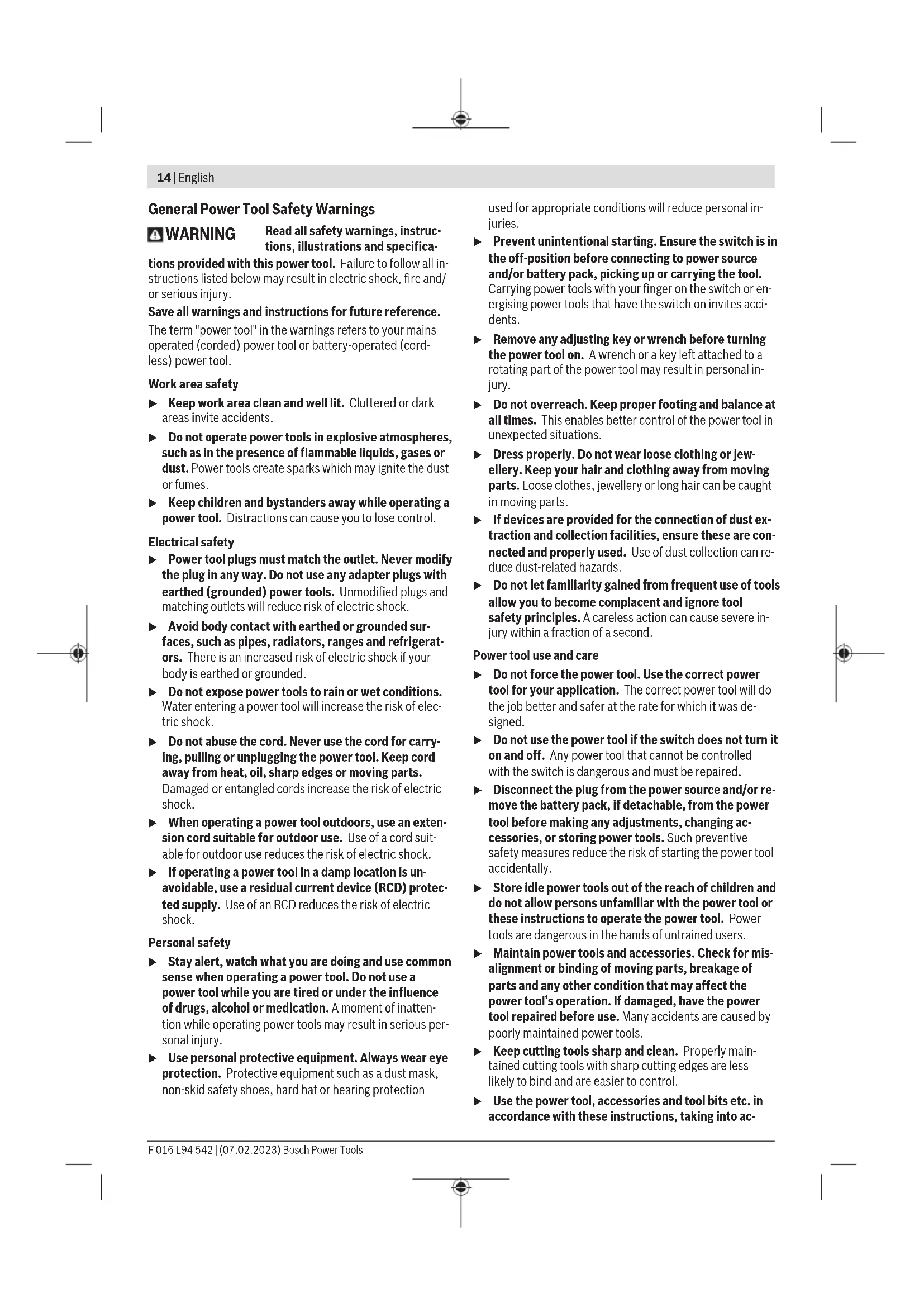 ance. Do not use a high-pressure washer or a garden hose to clean the machine. Bosch Power Tools F 016 L94 542 | (07.02.2023)14 | English General Power Tool Safety Warnings WARNING Read all safety warnings, instruc- tions, illustrations and specifica- tions provided with this power tool. Failure to follow all in- structions listed below may result in electric shock, fire and/ or serious injury. Save all warnings and instructions for future reference. The term "power tool" in the warnings refers to your mains- operated (corded) power tool or battery-operated (cord- less) power tool. Work area safety u Keep work area clean and well lit. Cluttered or dark areas invite accidents. u Do not operate power tools in explosive atmospheres, such as in the presence of flammable liquids, gases or dust. Power tools create sparks which may ignite the dust or fumes. u Keep children and bystanders away while operating a power tool. Distractions can cause you to lose control. Electrical safety u Power tool plugs must match the outlet. Never modify the plug in any way. Do not use any adapter plugs with earthed (grounded) power tools. Unmodified plugs and matching outlets will reduce risk of electric shock. u Avoid body contact with earthed or grounded sur- faces, such as pipes, radiators, ranges and refrigerat- ors. There is an increased risk of electric shock if your body is earthed or grounded. u Do not expose power tools to rain or wet conditions. Water entering a power tool will increase the risk of elec- tric shock. u Do not abuse the cord. Never use the cord for carry- ing, pulling or unplugging the power tool. Keep cord away from heat, oil, sharp edges or moving parts. Damaged or entangled cords increase the risk of electric shock. u When operating a power tool outdoors, use an exten- sion cord suitable for outdoor use. Use of a cord suit- able for outdoor use reduces the risk of electric shock. u If operating a power tool in a damp location is un- avoidable, use a residual current device (RCD) protec- ted supply. Use of an RCD reduces the risk of electric shock. Personal safety u Stay alert, watch what you are doing and use common sense when operating a power tool. Do not use a power tool while you are tired or under the influence of drugs, alcohol or medication. A moment of inatten- tion while operating power tools may result in serious per- sonal injury. u Use personal protective equipment. Always wear eye protection. Protective equipment such as a dust mask, non-skid safety shoes, hard hat or hearing protection used for appropriate conditions will reduce personal in- juries. u Prevent unintentional starting. Ensure the switch is in the off-position before connecting to power source and/or battery pack, picking up or carrying the tool. Carrying power tools with your finger on the switch or en- ergising power tools that have the switch on invites acci- dents. u Remove any adjusting key or wrench before turning the power tool on. A wrench or a key left attached to a rotating part of the power tool may result in personal in- jury. u Do not overreach. Keep proper footing and balance at all times. This enables better control of the power tool in unexpected situations. u Dress properly. Do not wear loose clothing or jew- ellery. Keep your hair and clothing away from moving parts. Loose clothes, jewellery or long hair can be caught in moving parts. u If devices are provided for the connection of dust ex- traction and collection facilities, ensure these are con- nected and properly used. Use of dust collection can re- duce dust-related hazards. u Do not let familiarity gained from frequent use of tools allow you to become complacent and ignore tool safety principles. A careless action can cause severe in- jury within a fraction of a second. Power tool use and care u Do not force the power tool. Use the correct power tool for your application. The correct power tool will do the job better and safer at the rate for which it was de- signed. u Do not use the power tool if the switch does not turn it on and off. Any power tool that cannot be controlled with the switch is dangerous and must be repaired. u Disconnect the plug from the power source and/or re- move the battery pack, if detachable, from the power tool before making any adjustments, changing ac- cessories, or storing power tools. Such preventive safety measures reduce the risk of starting the power tool accidentally. u Store idle power tools out of the reach of children and do not allow persons unfamiliar with the power tool or these instructions to operate the power tool. Power tools are dangerous in the hands of untrained users. u Maintain power tools and accessories. Check for mis- alignment or binding of moving parts, breakage of parts and any other condition that may affect the power tool’s operation. If damaged, have the power tool repaired before use. Many accidents are caused by poorly maintained power tools. u Keep cutting tools sharp and clean. Properly main- tained cutting tools with sharp cutting edges are less likely to bind and are easier to control. u Use the power tool, accessories and tool bits etc. in accordance with these instructions, taking into ac- F 016 L94 542 | (07.02.2023) Bosch Power ToolsEnglish | 15 count the working conditions and the work to be per- formed. Use of the power tool for operations different from those intended could result in a hazardous situation. u Keep handles and grasping surfaces dry, clean and free from oil and grease. Slippery handles and grasping surfaces do not allow for safe handling and control of the tool in unexpected situations. Battery tool use and care u Recharge only with the charger specified by the manu- facturer. A charger that is suitable for one type of bat- tery pack may create a risk of fire when used with another battery pack. u Use power tools only with specifically designated bat- tery packs. Use of any other battery packs may create a risk of injury and fire. u When battery p
