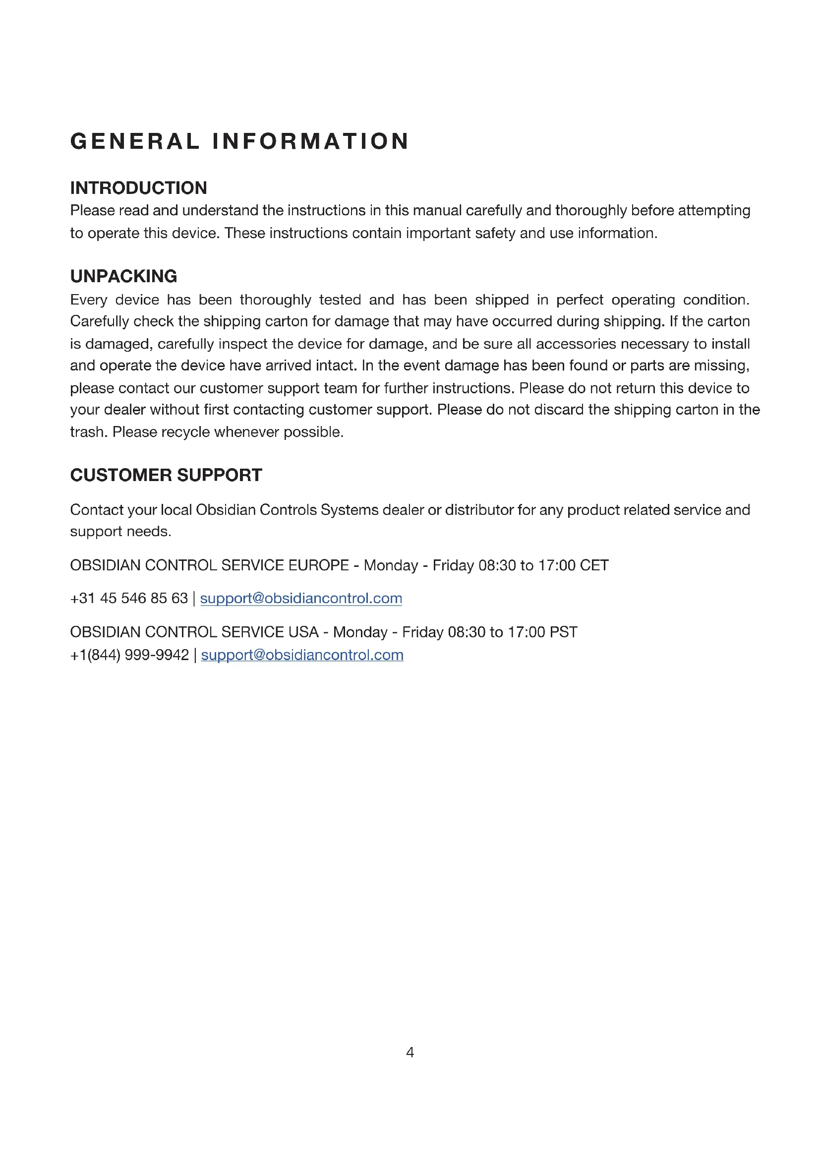 ©2021 OBSIDIAN CONTROL SYSTEMS all rights reserved. Information, specications, diagrams, images, and instructions herein are subject to change without notice. Obsidian Control Systems logo and identifying product names and numbers herein are trademarks of ADJ PRODUCTS LLC. Copyright protection claimed includes all forms and matters of copyrightable materials and information now allowed by statutory or judicial law or hereinafter granted. Product names used in this document may be trademarks or registered trademarks of their respective companies and are hereby acknowledged. All non-ADJ brands and product names are trademarks or registered trademarks of their respective companies. OBSIDIAN CONTROL SYSTEMS and all aliated companies hereby disclaim all liabilities for property, equipment, building, and electrical damages, injuries to any persons, and direct or indirect economic loss associated with the use or reliance of any information contained within this document, and/or as a result of the improper, unsafe, insucient and negligent assembly, installation, rigging, and operation of this product. ELATION PROFESSIONAL B.V. Junostraat 2 | 6468 EW Kerkrade, The Netherlands +31 45 546 85 66 Energy Saving Matters (EuP 2009/125/EC) Saving electric energy is a key to help protecting the environment. Please turn o all electrical products when they are not in use. To avoid power consumption in idle mode, disconnect all electrical equipment from power when not in use. Thank you! Document Version: An updated version of this document may be available online. Please check www.obsidiancontrol.com for the latest revision/update of this document before beginning installation and use. Date Document Version Note 07/12/2021 1 Initial Release 09/20/2021 2 Update Dimensions, Specications 12/13/2021 3 Updated FCC Statement3 GENERAL INFORMATION 4 LIMITED WARRANTY 5 SAFETY GUIDELINES 6 OVERVIEW 7 INSTALLATION 8 CONNECTIONS 9 OPERATION 10 MAINTENANCE 11 SPECIFICATIONS 12 DIMENSIONS 13 FCC STATEMENT 14 CONTENTS4 GENERAL INFORMATION INTRODUCTION Please read and understand the instructions in this manual carefully and thoroughly before attempting to operate this device. These instructions contain important safety and use information. UNPACKING Every device has been thoroughly tested and has been shipped in perfect operating condition. Carefully check the shipping carton for damage that may have occurred during shipping. If the carton is damaged, carefully inspect the device for damage, and be sure all accessories necessary to install and operate the device have arrived intact. In the event damage has been found or parts are missing, please contact our customer support team for further instructions. Please do not return this device to your dealer without rst contacting customer support. Please do not discard the shipping carton in the trash. Please recycle whenever possible. CUSTOMER SUPPORT Contact your local Obsidian Controls Systems dealer or distributor for any product related service and support needs. OBSIDIAN CONTROL SERVICE EUROPE - Monday - Friday 08:30 to 17:00 CET +31 45 546 85 63 | support@obsidiancontrol.com OBSIDIAN CONTROL SERVICE USA - Monday - Friday 08:30 to 17:00 PST +1(844) 999-9942 | support@obsidiancontrol.com5 LIMITED WARRANTY
