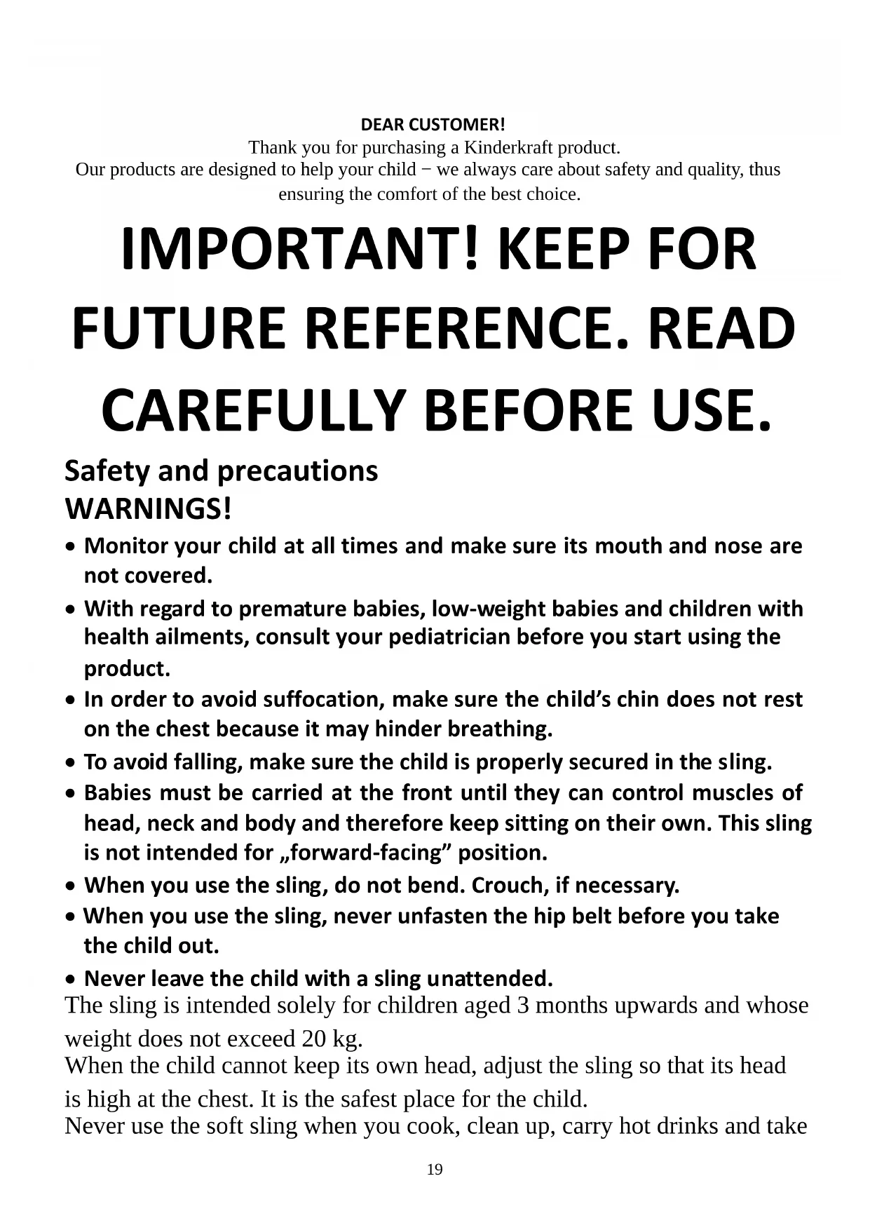 - Never leave the child with a sling unattended. The sling is intended solely for children aged 3 months upwards and whose weight does not exceed 20 kg. When the child cannot keep its own head, adjust the sling so that its head is high at the chest. It is the safest place for the child. Never use the soft sling when you cook, clean up, carry hot drinks and take20 other actions which may expose the child to burning or impact of chemicals. Be careful when you drink hot drinks, otherwise the hot liquid may hurt the child when in the sling. The sling serves to carry one child only. Your and your child’s movements may affect your balance. Remain careful when you bend forward or sideways. The sling must not be used when doing sports, for example running, cycling, swimming and skiing. Do not use the sling if any of its components/elements has been damaged, torn or lost. Do not assemble any accessories, spare parts or components which have not been supplied by the manufacturer. Users must be aware that fall risk rises as the child gets more active.