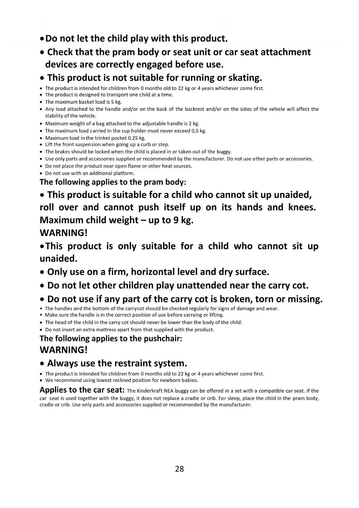 - Do not insert an extra mattress apart from that supplied with the product. The following applies to the pushchair: WARNING!