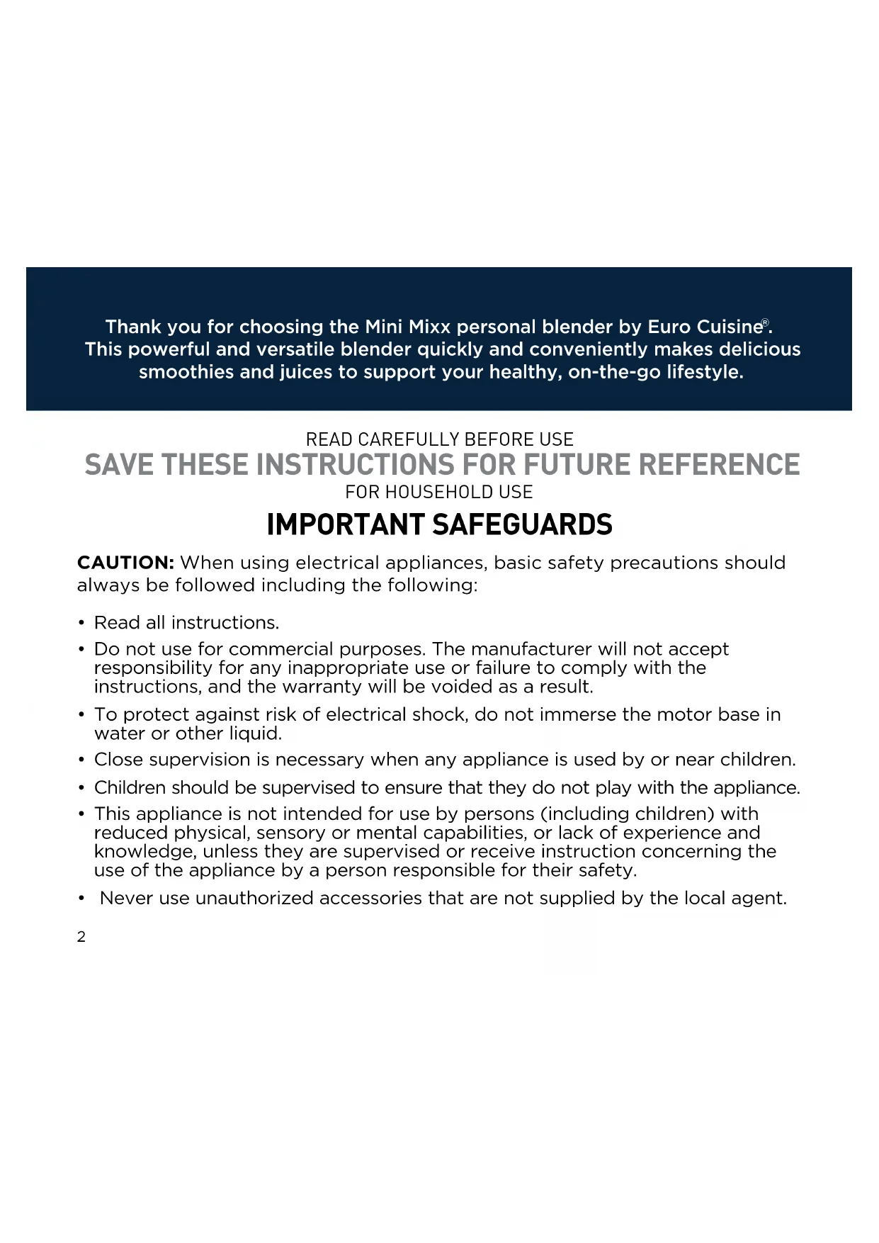 IMPORTANT SAFEGUARDS CAUTION: When using electrical appliances, basic safety precautions should always be followed including the following: Read all instructions. Do not use for commercial purposes. The manufacturer will not accept responsibility for any inappropriate use or failure to comply with the instructions, and the warranty will be voided as a result. To protect against risk of electrical shock, do not immerse the motor base in water or other liquid. Close supervision is necessary when any appliance is used by or near children. Children should be supervised to ensure that they do not play with the appliance. This appliance is not intended for use by persons (including children) with reduced physical, sensory or mental capabilities, or lack of experience and knowledge, unless they are supervised or receive instruction concerning the use of the appliance by a person responsible for their safety. Never use unauthorized accessories that are not supplied by the local agent.