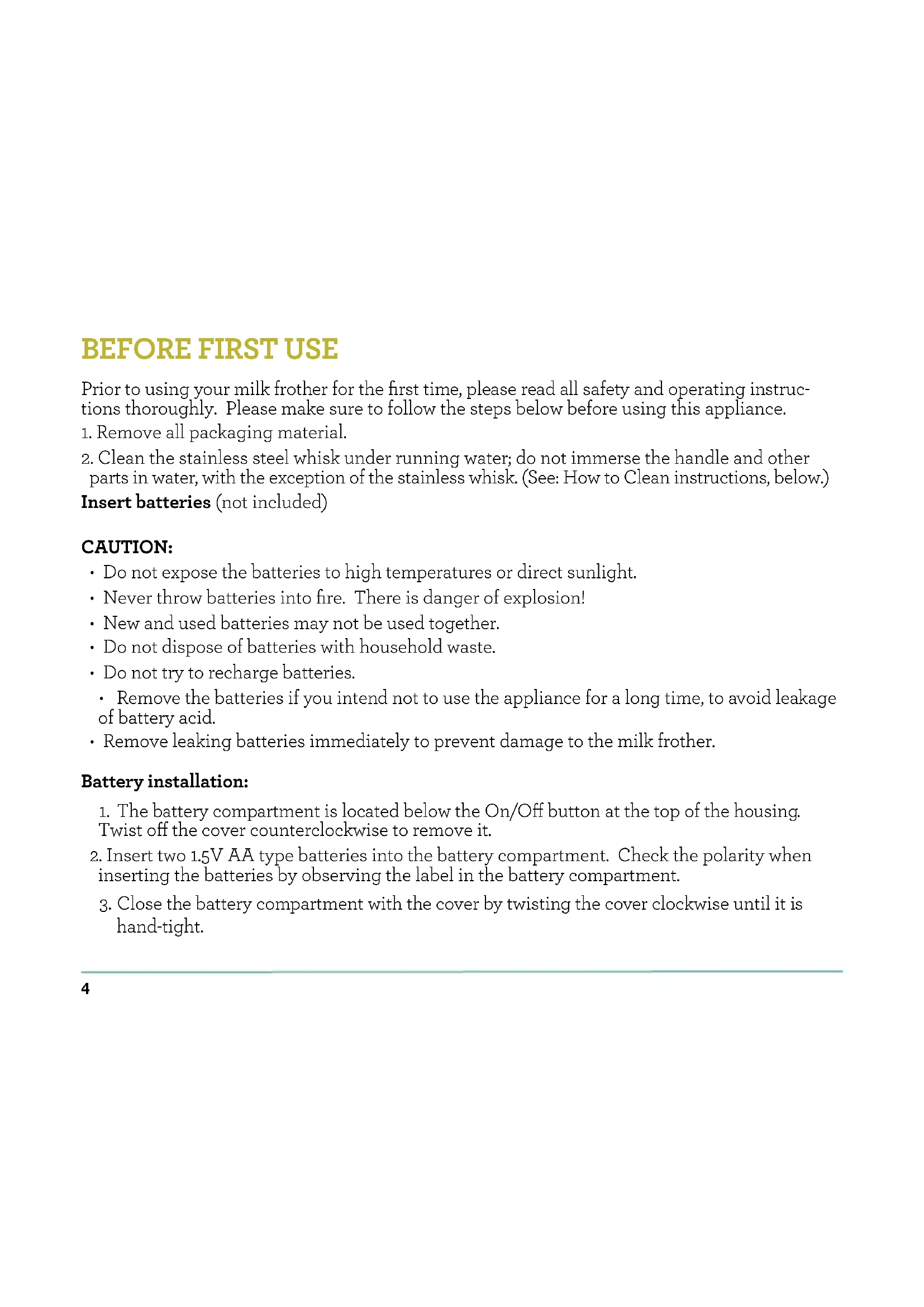 parts in water, with the exception of the stainless whisk. (See: How to Clean instructions, below.) Insert batteries (not included) CAUTION: