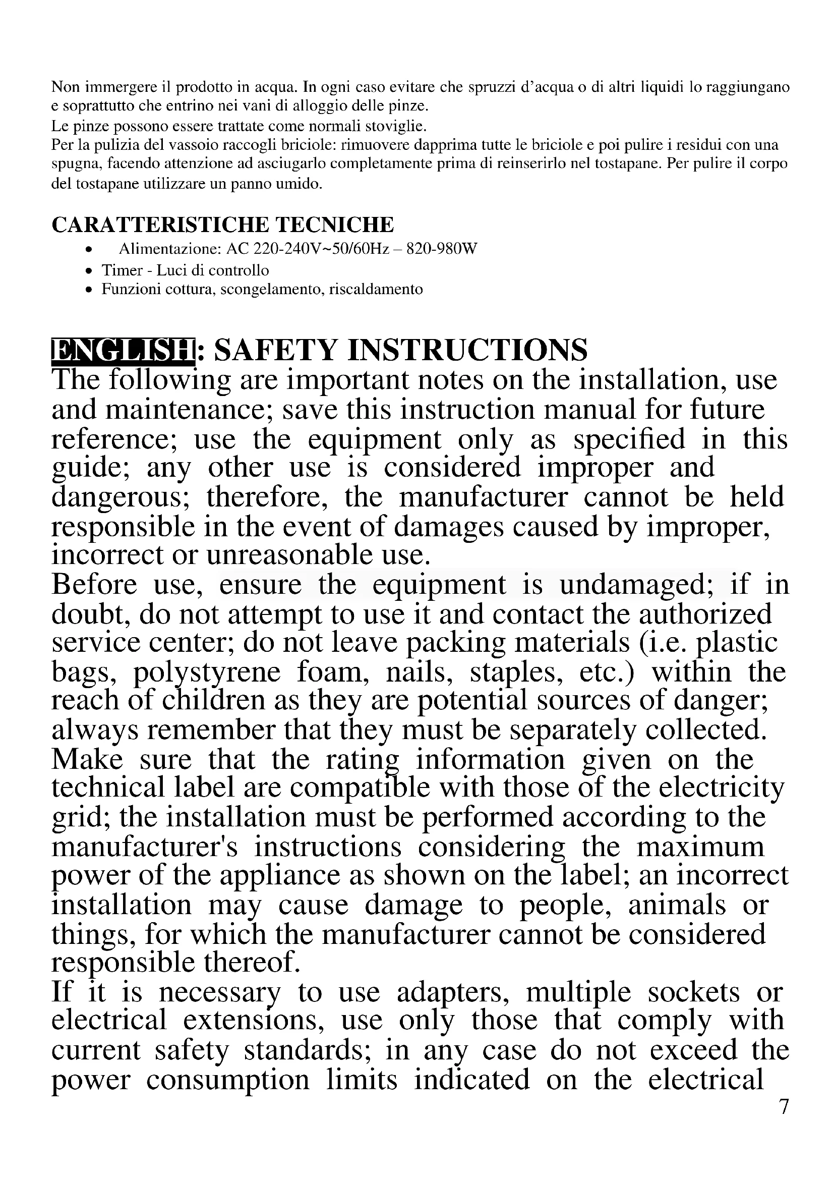 Surfaces, other than functional surfaces may develop high temperatures. Since temperatures are perceived differently by different people, this device should be used with CAUTION. Hold the appliance exclusively to grip surfaces intended to be touched. - This appliance is intended to be used in household and similar applications such as: staff kitchen areas in shops, offices and other working environments; by clients in hotels, motels and other residential type environments; farm houses, bed and breakfast type environments. - The appliance is not intended to be operated by means of an external timer or separate remote-control system. - Before every use, unroll the power cord. - Do not subject the product to strong impacts, serious damages may result. - Do not use near or under flammable materials (like curtains), heat, cold spots and steam. GENERAL INFORMATION - When you first use the appliance, the electric resistance can emit smoke. Do not worry because the smoke will disappear after a few uses. First of all, clean all the parts that will be in touch with food such as the pliers. CAUTION: risk of burn! After having turn on the unit, avoid touching it since some parts become very hot. Handle with care freshly-cooked food. - Touch only the handles of the pliers and the buttons while the unit is running. Use only for food preparation. - Place the toaster on stable shelves. Never leave the appliance unattended while it is working. - Always place the slices of bread or food inside the special pliers and be careful not to include foods that are10 too large in relation with the capacity of cooking slots. - Always use the toaster with crumb tray inserted, making sure it is assembled correctly. - Do not use to cook food containing jam, chocolate spread, or foods that might drip in general. - Once finished, unplug it and wait for the cooling of each part of the unit before storing. - Do not immerse the product in water or other liquids. In any case prevent splashes of water or other liquids from reaching the toaster. DESCRIPTION TP20 1 On-off lever 2 Cooking slots 3 Removable crumb tray 4 Body 5 Safety switch-off button/Cancel 6 Keep-warm button/Reheat 7 Defrost button 8 Timer 9 Stainless steel plyers OPERATING This bread toaster is suitable for cooking and heating tasty toast and toasted bread. Thanks to the defrost function, activated by the button (7) "Defrost", it is also possible to defrost bread or toast. Cooking - Make sure that the lever (1) is in the high position. - Place the product on a flat and stable surface and connect the plug to the power outlet. - Set the timer (8) depending on the taste, the thickness of the bread and the roast that you want to achieve. - Place food in the special pliers and put the clamps in the slots (2). - Lower the lever (1) to start cooking. During cooking, check that food does not burn. If you want to stop cooking, at any time you can press the OFF/Cancel button (5). - After cooking, the lever (1) lifts automatically to power off the equipment. To take them out, grab the pliers from the special handles without touching the toaster, especially the top. - Unplug the unit and wait for the complete cooling of each part, before storing the appliance. Defrost - This function allows you to heat the cooking slots at a temperature suitable for defrosting bread. To use this option, after you have set the timer (8) and turn down the lever (1), press defrost button (7). Heating - This function allows you to heat the coking slots enough to maintain the temperature of the bread, or heating some cold food. To use this option, after you have set the timer (8) and turn down the lever (1), press the heat button (6). CLEANING Unplug the unit from the electrical outlet and let it cool down before starting cleaning operations. Do not immerse the unit in water. In any case, avoid any splashing of water or other liquids, and pay attention the water does not enter the slots for pliers. The pliers can be treated like normal dishes. Clean the crumb tray by removing first all the crumbs and then wipe off the residue with a sponge, making sure to dry completely before replacing it in the toaster. Clean the body of the toaster with a damp cloth. TECHNICAL FEATURES