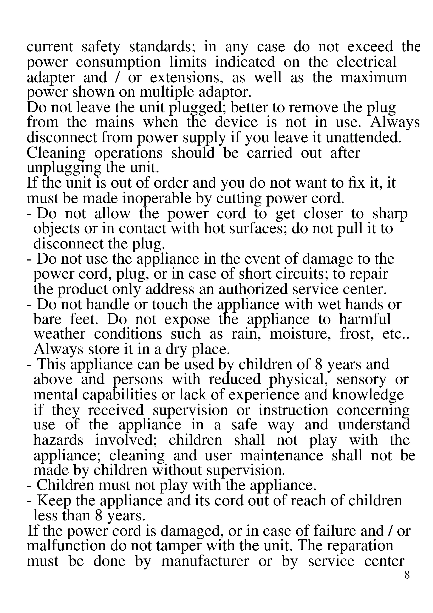 The following are important notes on the installation, use and maintenance; save this instruction manual for future reference; use the equipment only as specified in this guide; any other use is considered improper and dangerous; therefore, the manufacturer cannot be held responsible in the event of damages caused by improper, incorrect or unreasonable use. Before use, ensure the equipment is undamaged; if in doubt, do not attempt to use it and contact the authorized service center; do not leave packing materials (i.e. plastic bags, polystyrene foam, nails, staples, etc.) within the reach of children as they are potential sources of danger; always remember that they must be separately collected. Make sure that the rating information given on the technical label are compatible with those of the electricity grid; the installation must be performed according to the manufacturer's instructions considering the maximum power of the appliance as shown on the label; an incorrect installation may cause damage to people, animals or things, for which the manufacturer cannot be considered responsible thereof. If it is necessary to use adapters, multiple sockets or electrical extensions, use only those that comply with8 current safety standards; in any case do not exceed the power consumption limits indicated on the electrical adapter and / or extensions, as well as the maximum power shown on multiple adaptor. Do not leave the unit plugged; better to remove the plug from the mains when the device is not in use. Always disconnect from power supply if you leave it unattended. Cleaning operations should be carried out after unplugging the unit. If the unit is out of order and you do not want to fix it, it must be made inoperable by cutting power cord. - Do not allow the power cord to get closer to sharp objects or in contact with hot surfaces; do not pull it to disconnect the plug. - Do not use the appliance in the event of damage to the power cord, plug, or in case of short circuits; to repair the product only address an authorized service center. - Do not handle or touch the appliance with wet hands or bare feet. Do not expose the appliance to harmful weather conditions such as rain, moisture, frost, etc.. Always store it in a dry place. - This appliance can be used by children of 8 years and above and persons with reduced physical, sensory or mental capabilities or lack of experience and knowledge if they received supervision or instruction concerning use of the appliance in a safe way and understand hazards involved; children shall not play with the appliance; cleaning and user maintenance shall not be made by children without supervision. - Children must not play with the appliance. - Keep the appliance and its cord out of reach of children less than 8 years. If the power cord is damaged, or in case of failure and / or malfunction do not tamper with the unit. The reparation must be done by manufacturer or by service center9 authorized by the manufacturer in order to prevent any risk. Failure to comply with the above may compromise the unit safety and invalidate the warranty.