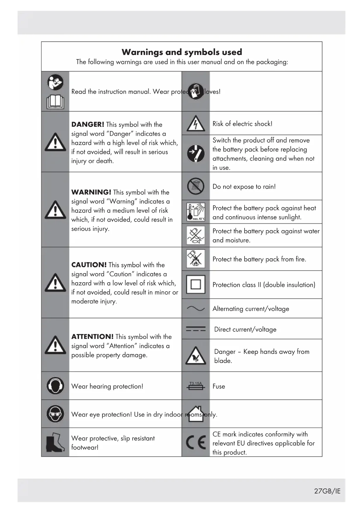 keep your balance. Do not work while standing on unstable support. z Vibration and noise reduction To reduce the impact of noise and vibration emission, limit the time of operation, use low- vibration and low-noise operating modes as well as wear personal protective equipment. Take the following points into account to minimise the vibration and noise exposure risks: Only use the product as intended by its design and these instructions. Ensure that the product is in good condition and well maintained. Use correct accessory tools for the product and ensure they are in good condition. Keep tight grip on the handles/grip surface. Maintain this product in accordance with these instructions and keep it well lubricated (where appropriate).36 GB/IE Plan your work schedule to spread any high vibration tool use across a longer period of time. z Behaviour in emergency situations Familiarise yourself with the use of this product by means of this instruction manual. Memorise the safety warnings and follow them to the letter. This will help to prevent risks and hazards. Always be alert when using this product, so that you can recognise and handle risks early. Fast intervention can prevent serious injury and damage to property. Switch the product off and disconnect it from the mains if there are malfunctions. Have the product checked by a qualified professional and repaired, if necessary, before you operate it again. z Residual risks Even if properly operating and handling the product, some residual risks will remain. Due to its construction and build, the product may present the following hazards: – Cuts – Hearing loss if working without hearing protection. – Damage caused to your health resulting from hand/arm vibrations if the power tool is used over a longer period of time or if it is not properly used and maintained. NOTE