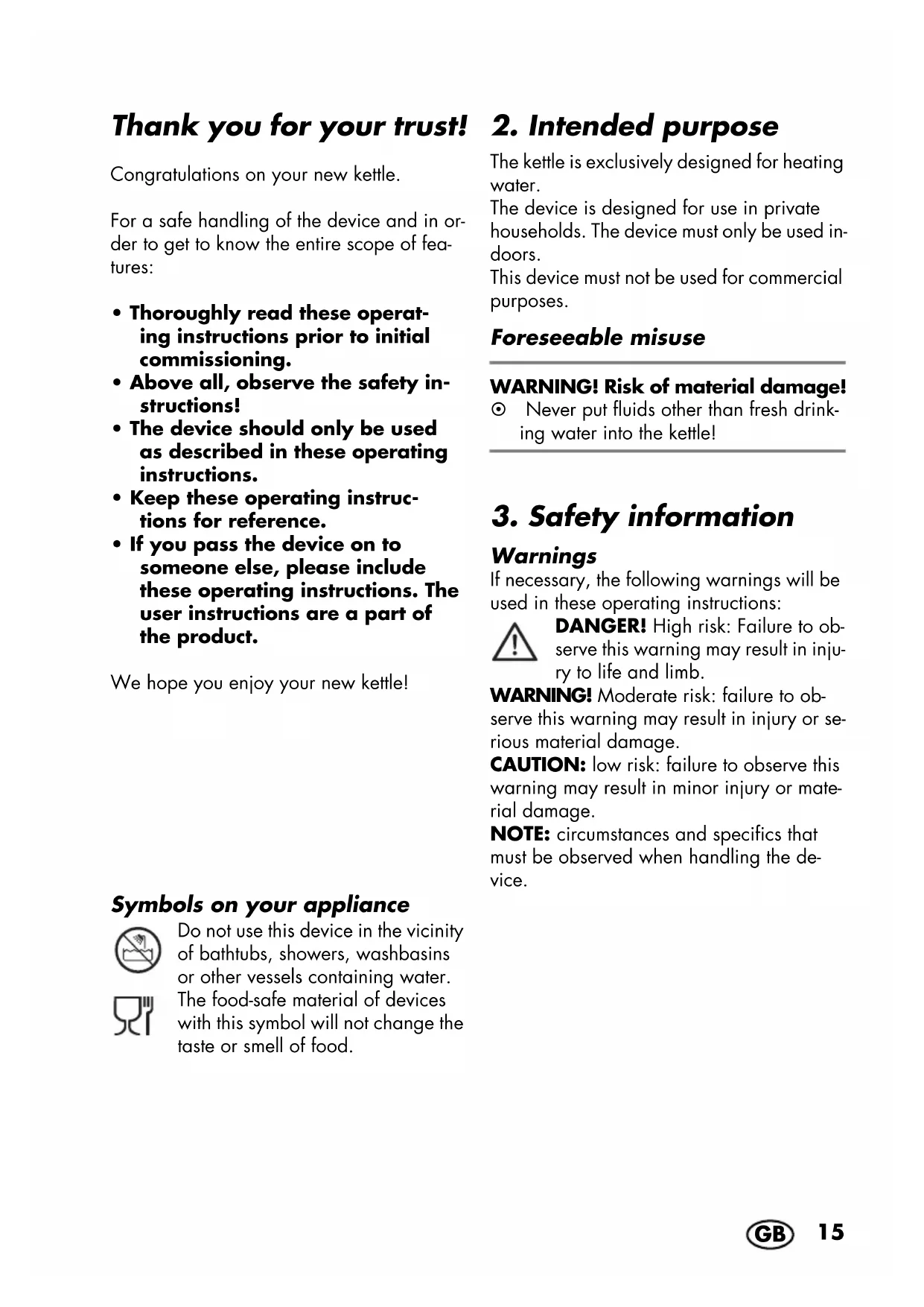 The kettle is exclusively designed for heating water. The device is designed for use in private households. The device must only be used in- doors. This device must not be used for commercial purposes. Foreseeable misuse WARNING! Risk of material damage! ~ Never put fluids other than fresh drink- ing water into the kettle!