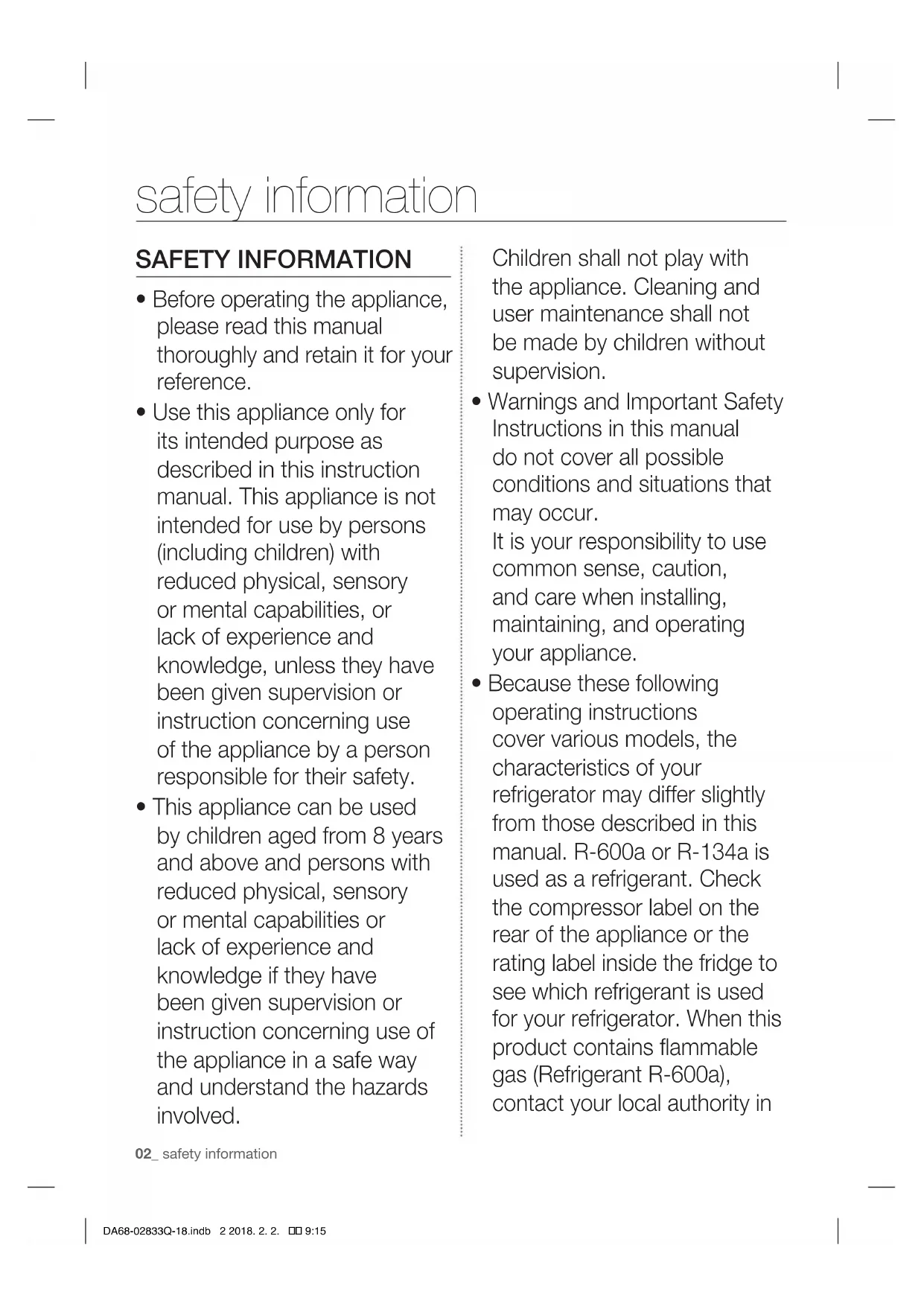 - Because these following operating instructions cover various models, the characteristics of your refrigerator may differ slightly from those described in this manual. R-600a or R-134a is used as a refrigerant. Check the compressor label on the rear of the appliance or the rating label inside the fridge to see which refrigerant is used for your refrigerator. When this product contains flammable gas (Refrigerant R-600a), contact your local authority in safety information DA68-02833Q-18.indb 2 2018. 2. 2. 9:15safety information _03 regard to safe disposal of this product.
