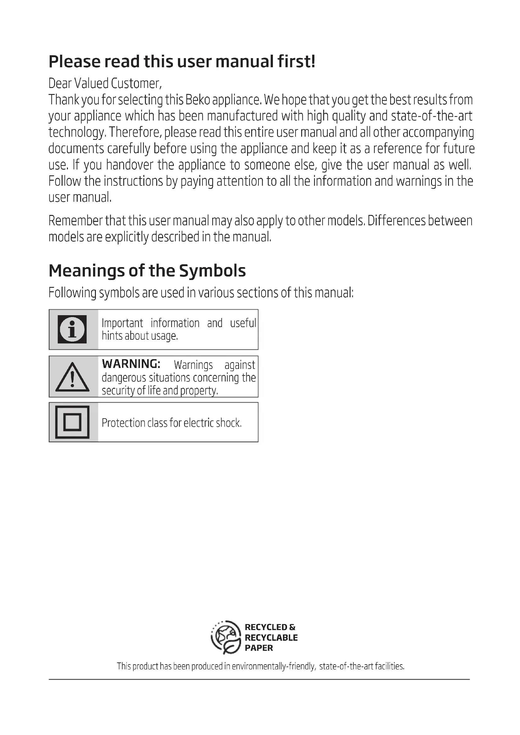 ESKY 87-96 POLSKI 97-109 BULGARIAN 110-120 MAGYAR 121-131 NEDERLANDS 132-142 RUSSIAN 143-156Please read this user manual first! Dear Valued Customer, Thank you for selecting this Beko appliance. We hope that you get the best results from your appliance which has been manufactured with high quality and state-of-the-art technology. Therefore, please read this entire user manual and all other accompanying documents carefully before using the appliance and keep it as a reference for future use. If you handover the appliance to someone else, give the user manual as well. Follow the instructions by paying attention to all the information and warnings in the user manual. Remember that this user manual may also apply to other models. Differences between models are explicitly described in the manual. Meanings of the Symbols Following symbols are used in various sections of this manual: