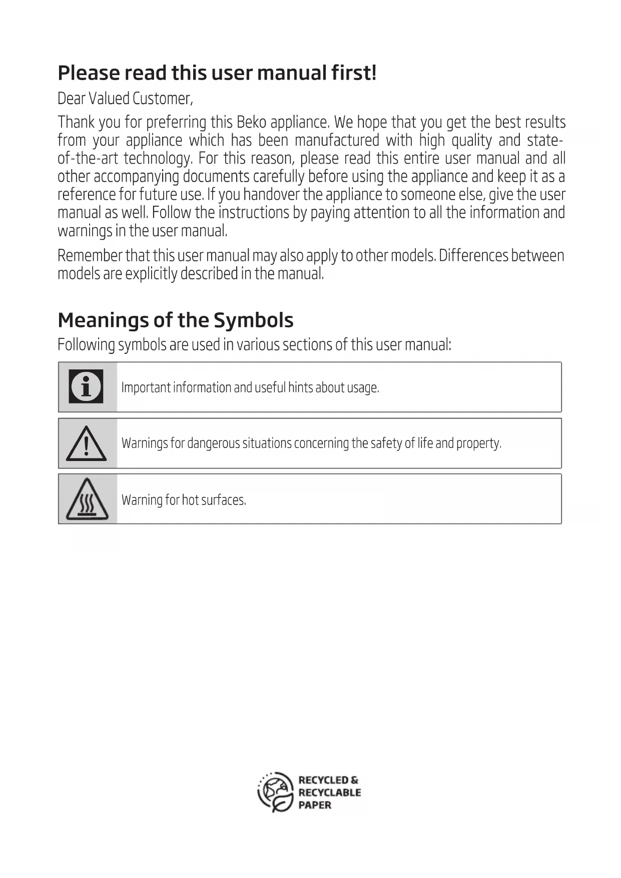 TÜRKÇE 311-331Please read this user manual first! Dear Valued Customer, Thank you for preferring this Beko appliance. We hope that you get the best results from your appliance which has been manufactured with high quality and state- of-the-art technology. For this reason, please read this entire user manual and all other accompanying documents carefully before using the appliance and keep it as a reference for future use. If you handover the appliance to someone else, give the user manual as well. Follow the instructions by paying attention to all the information and warnings in the user manual. Remember that this user manual may also apply to other models. Differences between models are explicitly described in the manual. Meanings of the Symbols Following symbols are used in various sections of this user manual: