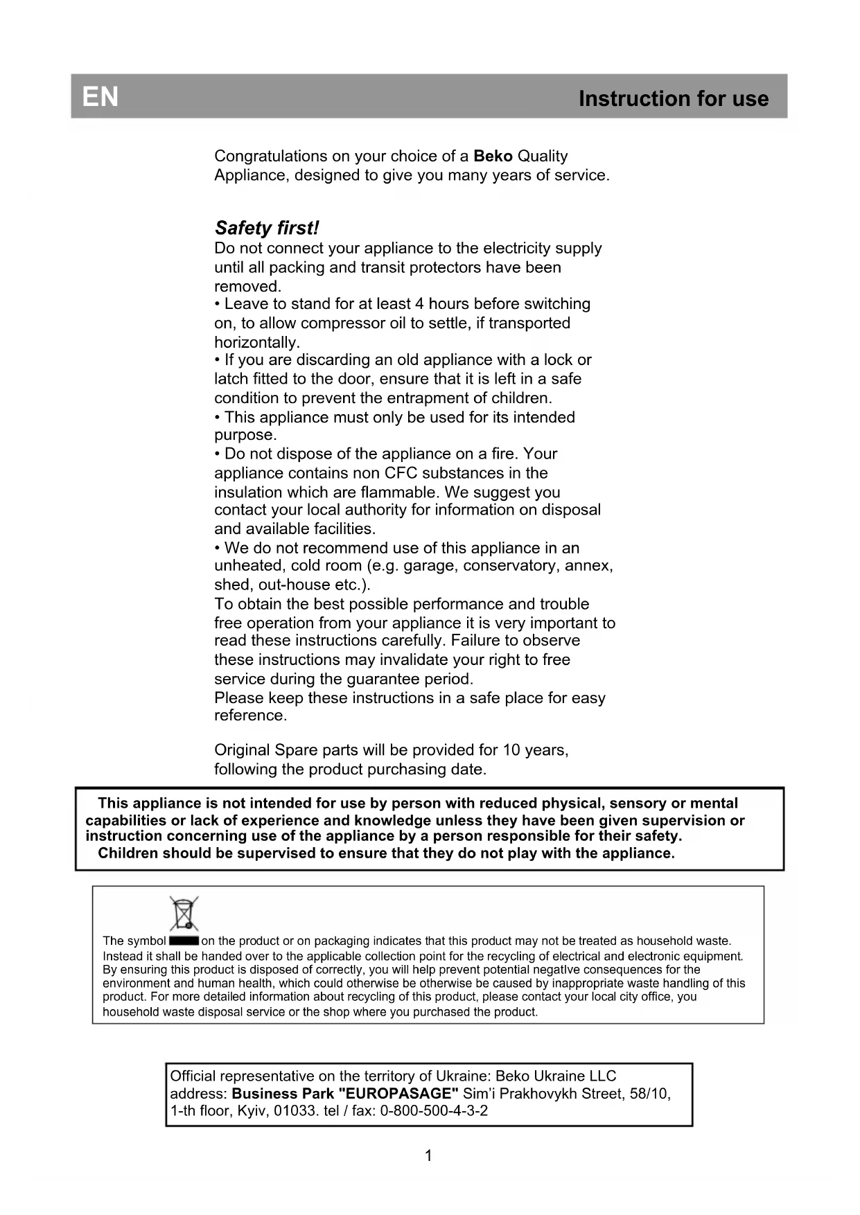 This appliance is not intended for use by person with reduced physical, sensory or mental capabilities or lack of experience and knowledge unless they have been given supervision or instruction concerning use of the appliance by a person responsible for their safety. Children should be supervised to ensure that they do not play with the appliance. The symbol on the product or on packaging indicates that this product may not be treated as household waste. Instead it shall be handed over to the applicable collection point for the recycling of electrical and electronic equipment. By ensuring this product is disposed of correctly, you will help prevent potential negatIve consequences for the environment and human health, which could otherwise be otherwise be caused by inappropriate waste handling of this product. For more detailed information about recycling of this product, please contact your local city office, you household waste disposal service or the shop where you purchased the product. Official representative on the territory of Ukraine: Beko Ukraine LLC address: Business Park "EUROPASAGE" Sim’i Prakhovykh Street, 58/10, 1-th floor, Kyiv, 01033. tel / fax: 0-800-500-4-3-2EN Instruction for use Electrical requirements Before inserting the plug into the wall socket make sure that the voltage and the frequency shown in the rating plate inside the appliance corresponds to your electricity supply. We recommend that this appliance is connected to the mains supply via a suitably switched and fused socket in a readily accessible position. Warning! This appliance must be earthed. Repairs to electrical equipment should only be performed by a qualified technician. Incorrect repairs carried out by an unqualified person are carry risks that may have critical consequences for the user of the appliance. ATTENTION! This appliance operates with R600a which is an environmental friendly but flammable gas. During the transportation and fixing of the product, care must be taken not to damage the cooling system. If the cooling system is damaged and there is a gas leakage from the system, keep the product away from open flame sources and ventilate the room for a while. WARNING - Do not use mechanical devices or other means to accelerate the defrosting process, others than those recommended by the manufacturer. WARNING - Do not damage the refrigerant circuit. WARNING - Do not use electrical appliances inside the food storage compartments of the appliance, unless they are of the type recommended by the manufacturer. WARNING - If the supply cord is damaged, it must be replaced by the manufacturer, its service agent or similarly qualified persons in order to avoid a hazard. Transportation instructions
