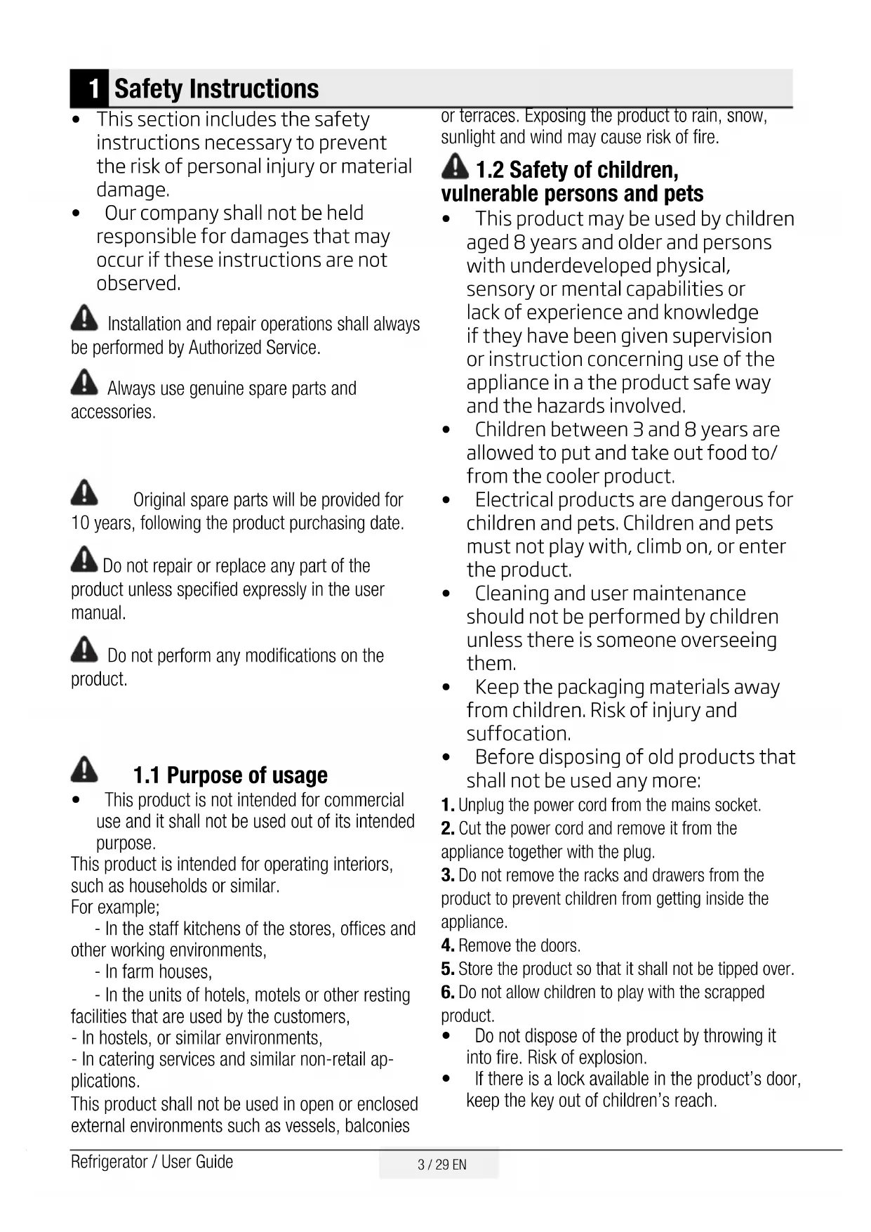 8 Troubleshooting 293 / 29 EN Refrigerator / User Guide 1 Safety Instructions t This section includes the safety instructions necessary to prevent the risk of personal injury or material damage. t Our company shall not be held responsible for damages that may occur if these instructions are not observed. Installation and repair operations shall always be performed by Authorized Service. Always use genuine spare parts and accessories. Original spare parts will be provided for 10 years, following the product purchasing date. Do not repair or replace any part of the product unless specified expressly in the user manual. Do not perform any modifications on the product.