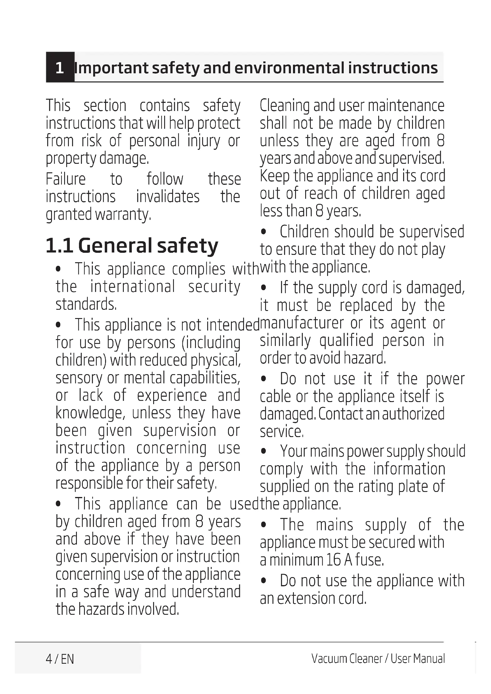 - Do not use the appliance with an extension cord.Vacuum Cleaner / User Manual 5 / EN 1 Important safety and environmental instructions