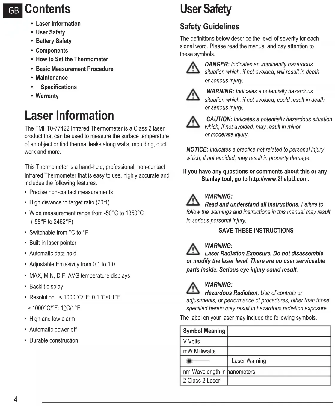 situation which, if not avoided, could result in death or serious injury. CAUTION: Indicates a potentially hazardous situation which, if not avoided, may result in minor or moderate injury. NOTICE: Indicates a practice not related to personal injury which, if not avoided, may result in property damage. If you have any questions or comments about this or any Stanley tool, go to http://www.2helpU.com.