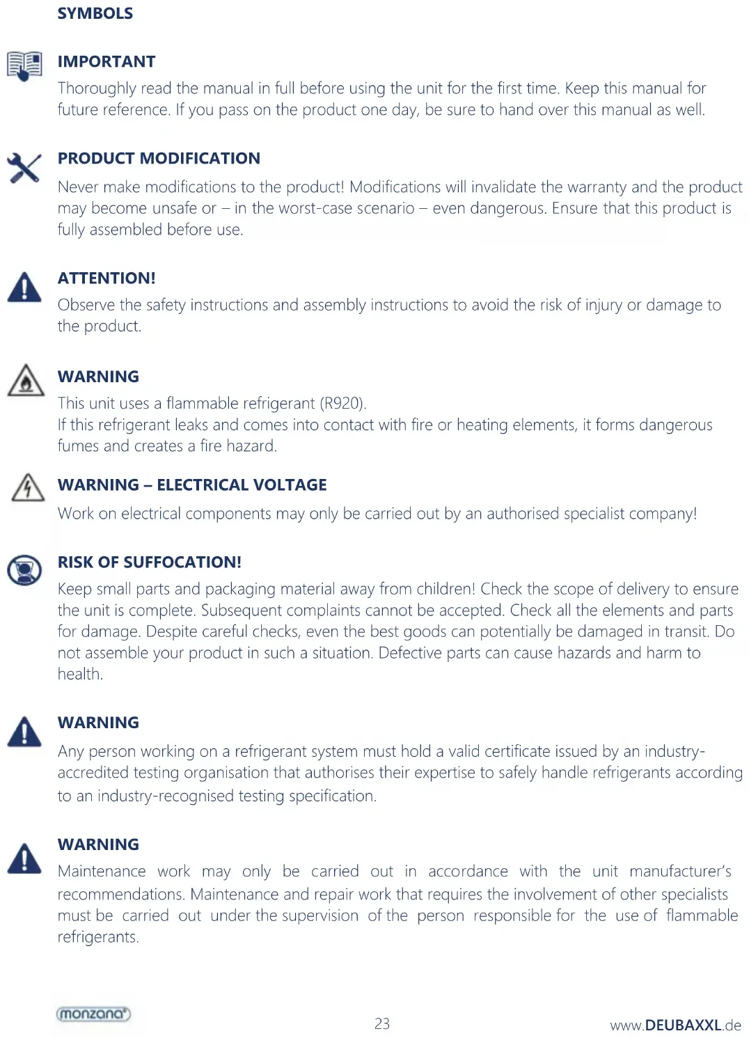 Work on electrical components may only be carried out by an authorised specialist company! RISK OF SUFFOCATION! Keep small parts and packaging material away from children! Check the scope of delivery to ensure the unit is complete. Subsequent complaints cannot be accepted. Check all the elements and parts for damage. Despite careful checks, even the best goods can potentially be damaged in transit. Do not assemble your product in such a situation. Defective parts can cause hazards and harm to health. WARNING Any person working on a refrigerant system must hold a valid certificate issued by an industry- accredited testing organisation that authorises their expertise to safely handle refrigerants according to an industry-recognised testing specification. WARNING Maintenance work may only be carried out in accordance with the unit manufacturer’s recommendations. Maintenance and repair work that requires the involvement of other specialists must be carried out under the supervision of the person responsible for the use of flammable refrigerants.24 www.DEUBAXXL.de Safety instructions on the unit Do not remove any safety signs on the unit. Keep the safety signs, stickers and labels in a legible condition. The following safety instructions are attached to the unit
