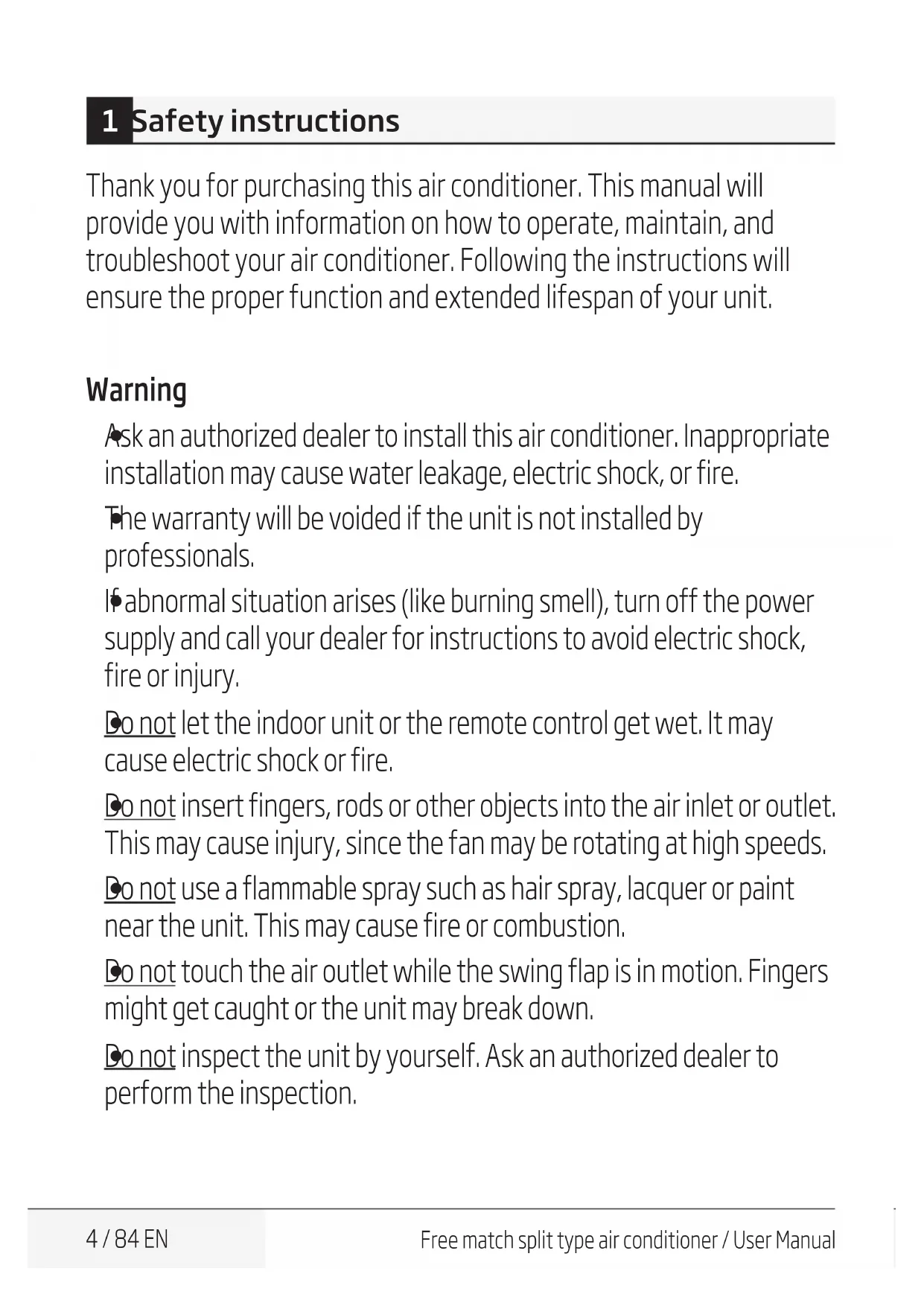 Do not let children play with the air conditioner. 1 Safety instructions6 / 84 EN Free match split type air conditioner / User Manual