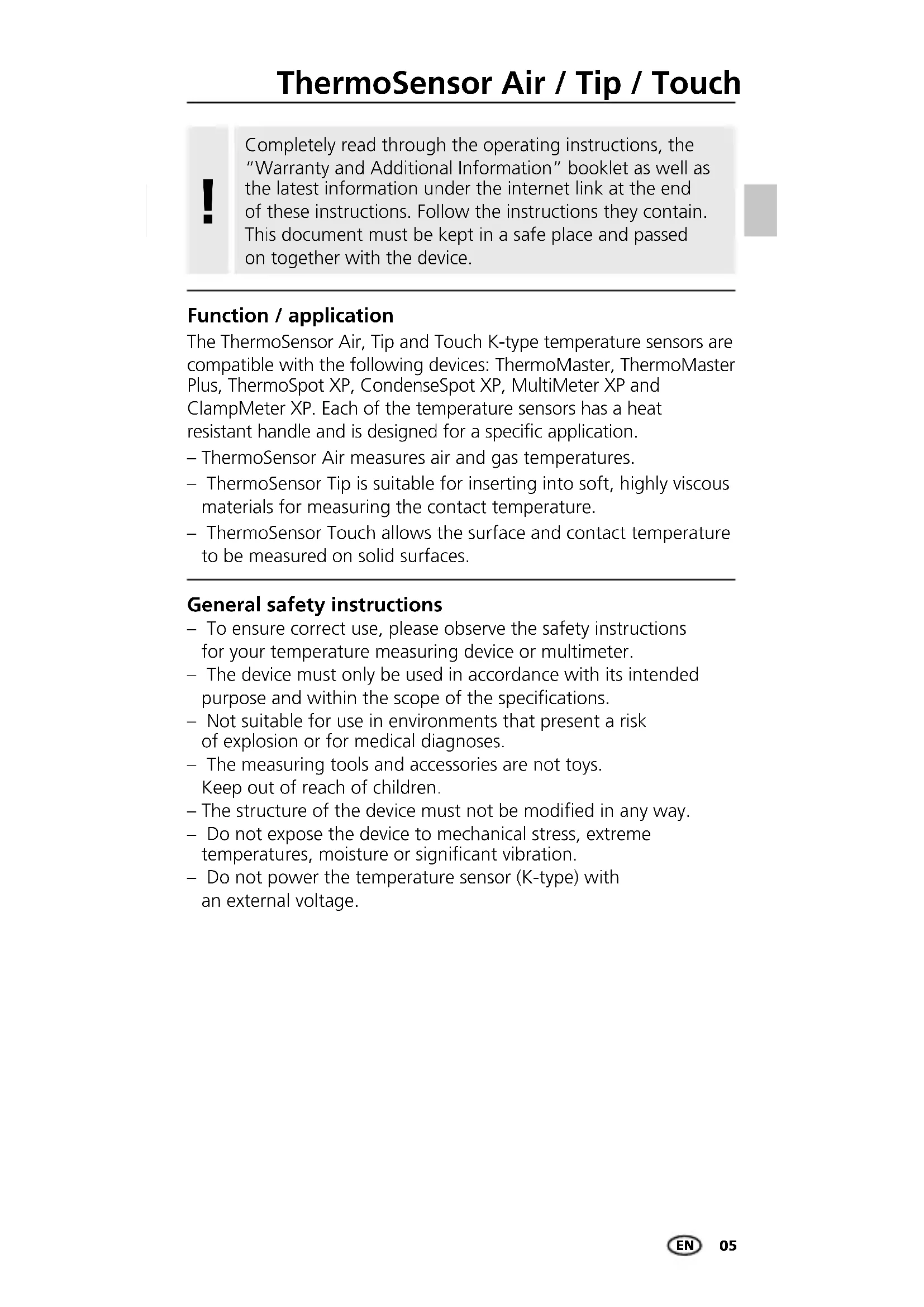 The ThermoSensor Air, Tip and Touch K-type temperature sensors are compatible with the following devices: ThermoMaster, ThermoMaster Plus, ThermoSpot XP, CondenseSpot XP, MultiMeter XP and ClampMeter XP. Each of the temperature sensors has a heat resistant handle and is designed for a specic application. – ThermoSensor Air measures air and gas temperatures. – ThermoSensor Tip is suitable for inserting into soft, highly viscous materials for measuring the contact temperature. – ThermoSensor Touch allows the surface and contact temperature to be measured on solid surfaces. – To ensure correct use, please observe the safety instructions for your temperature measuring device or multimeter. – The device must only be used in accordance with its intended purpose and within the scope of the specications. – Not suitable for use in environments that present a risk of explosion or for medical diagnoses. – The measuring tools and accessories are not toys. Keep out of reach of children. – The structure of the device must not be modied in any way. – Do not expose the device to mechanical stress, extreme temperatures, moisture or signicant vibration. – Do not power the temperature sensor (K-type) with an external voltage. General safety instructions Function / application Completely read through the operating instructions, the “Warranty and Additional Information” booklet as well as the latest information under the internet link at the end of these instructions. Follow the instructions they contain. This document must be kept in a safe place and passed on together with the device.