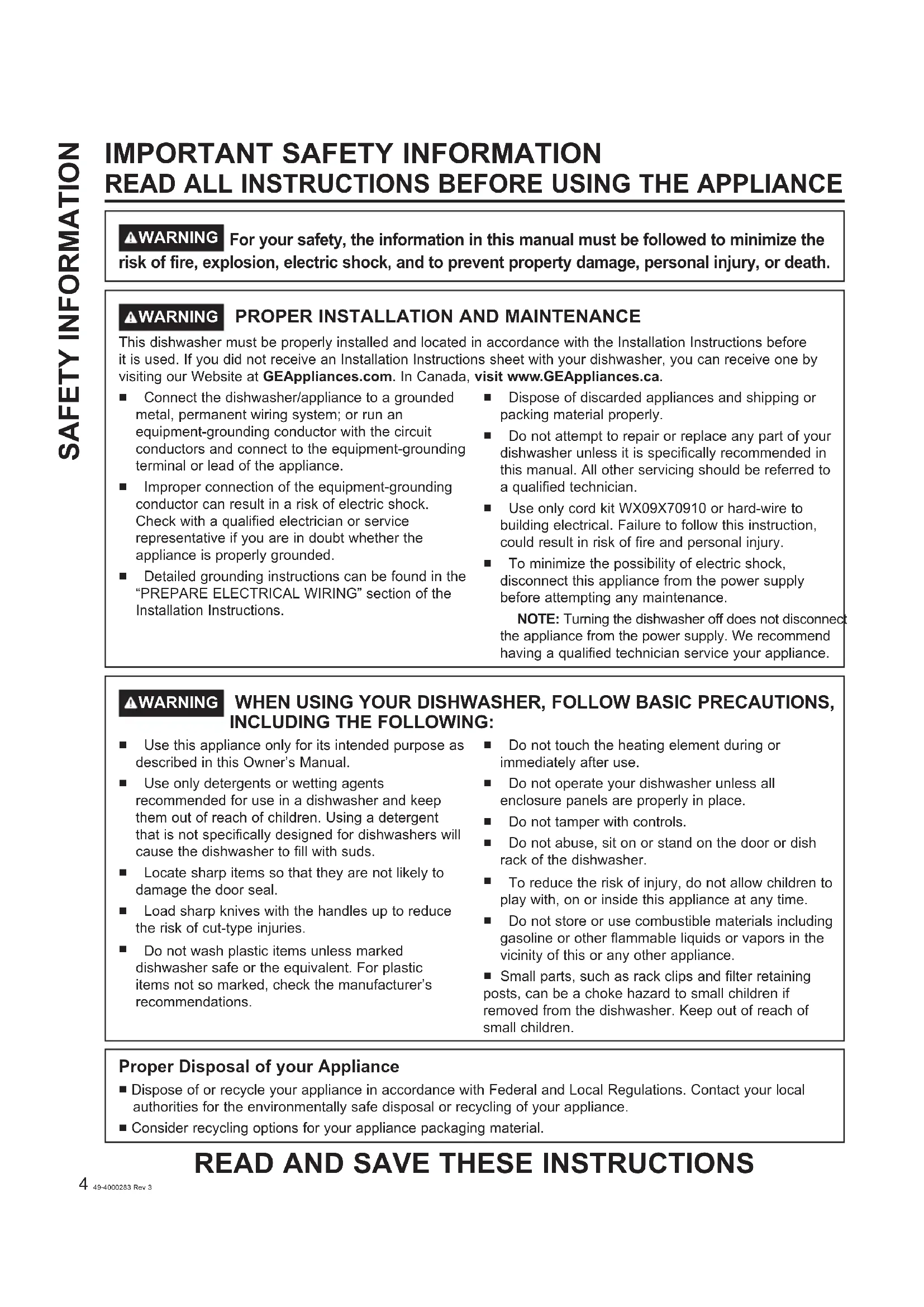 Connect the dishwasher/appliance to a grounded metal, permanent wiring system; or run an equipment-grounding conductor with the circuit conductors and connect to the equipment-grounding terminal or lead of the appliance. Improper connection of the equipment-grounding conductor can result in a risk of electric shock. Check with a qualified electrician or service representative if you are in doubt whether the appliance is properly grounded. Detailed grounding instructions can be found in the “PREPARE ELECTRICAL WIRING” section of the Installation Instructions. Dispose of discarded appliances and shipping or packing material properly. Do not attempt to repair or replace any part of your dishwasher unless it is specifically recommended in this manual. All other servicing should be referred to a qualified technician. Use only cord kit WX09X70910 or hard-wire to building electrical. Failure to follow this instruction, could result in risk of fire and personal injury. To minimize the possibility of electric shock, disconnect this appliance from the power supply before attempting any maintenance. NOTE: Turning the dishwasher off does not disconnect the appliance from the power supply. We recommend having a qualified technician service your appliance. WARNING WHEN USING YOUR DISHWASHER, FOLLOW BASIC PRECAUTIONS, INCLUDING THE FOLLOWING: