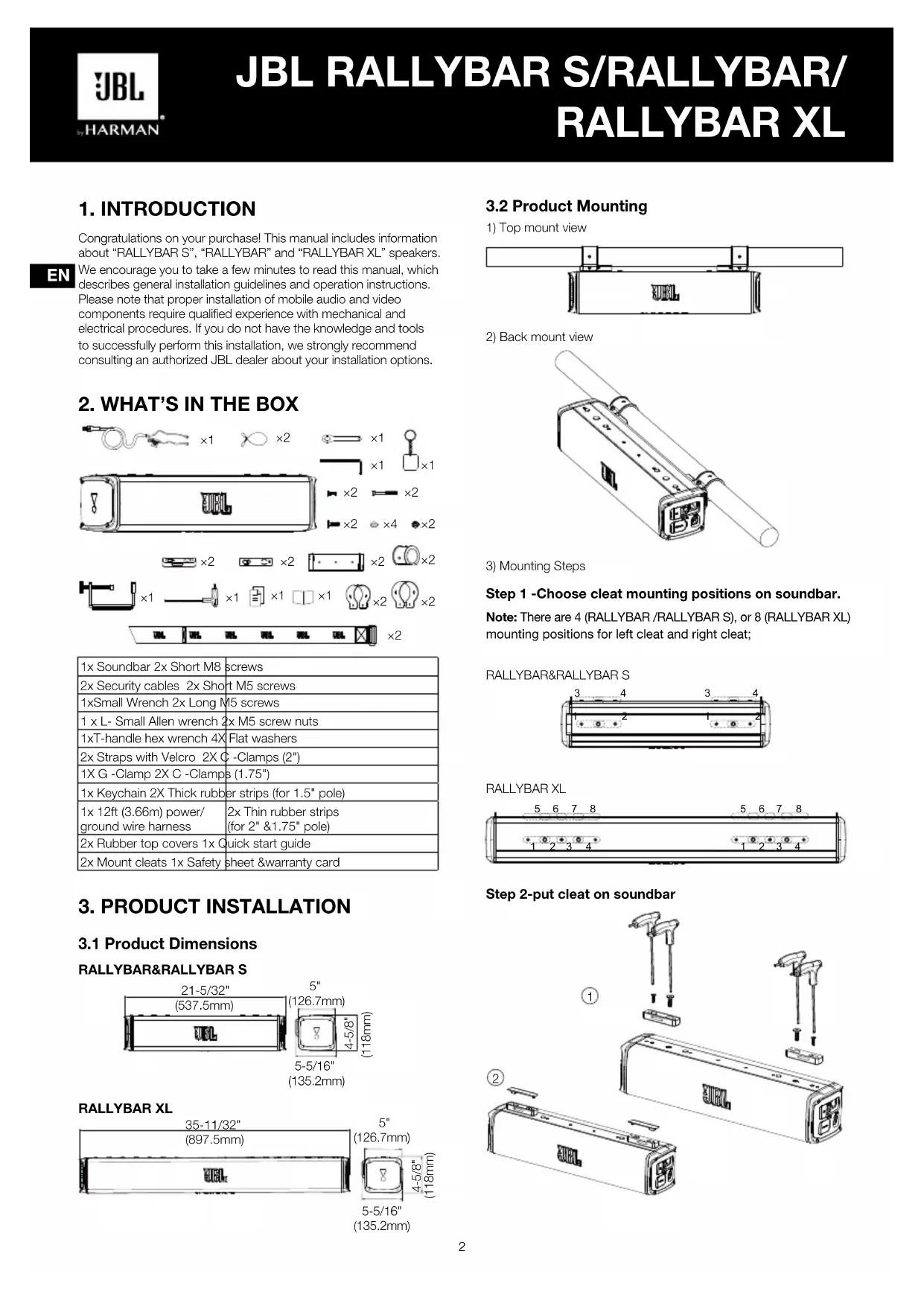 Congratulations on your purchase! This manual includes information about “RALLYBAR S”, “RALLYBAR” and “RALLYBAR XL” speakers. We encourage you to take a few minutes to read this manual, which describes general installation guidelines and operation instructions. Please note that proper installation of mobile audio and video components require qualified experience with mechanical and electrical procedures. If you do not have the knowledge and tools to successfully perform this installation, we strongly recommend consulting an authorized JBL dealer about your installation options.