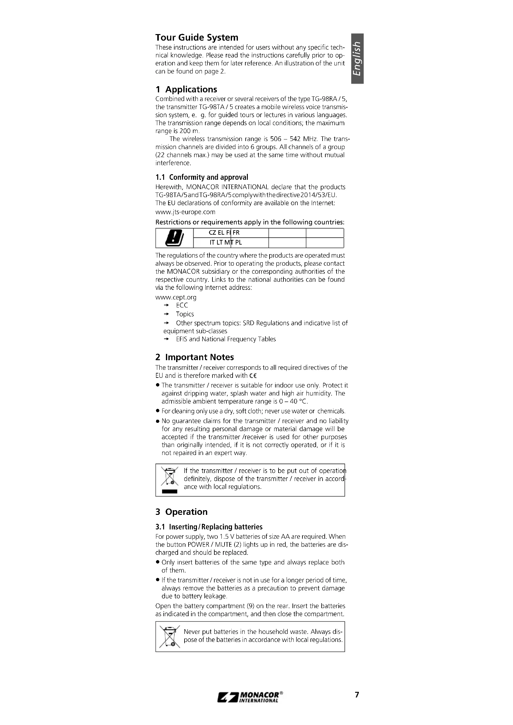 Herewith, MONACOR INTERNATIONAL declare that the products TG-98TA / 5 and TG-98RA / 5 comply with the directive 2014 / 53 / EU. The EU declarations of conformity are available on the Internet:www.jts-europe.comRestrictions or requirements apply in the following countries:CZ EL FI FRIT LT MT PLThe regulations of the country where the products are operated must always be observed. Prior to operating the products, please contact the MONACOR subsidiary or the corresponding authorities of the respective country. Links to the national authorities can be found via the following Internet address:www.cept.org t ECC t Topics t Other spectrum topics: SRD Regulations and indicative list of equipment sub-classes t EFIS and National Frequency Tables 2 Important Notes The transmitter / receiver corresponds to all required directives of the EU and is therefore marked with . The transmitter / receiver is suitable for indoor use only. Protect it against dripping water, splash water and high air humidity. The admissible ambient temperature range is 0 – 40 °C. For cleaning only use a dry, soft cloth; never use water or chemicals. No guarantee claims for the transmitter / receiver and no liability for any resulting personal damage or material damage will be accepted if the transmitter / receiver is used for other purposes than originally intended, if it is not correctly operated, or if it is not repaired in an expert way.If the transmitter / receiver is to be put out of operation definitely, dispose of the transmitter / receiver in accord-ance with local regulations. 3 Operation