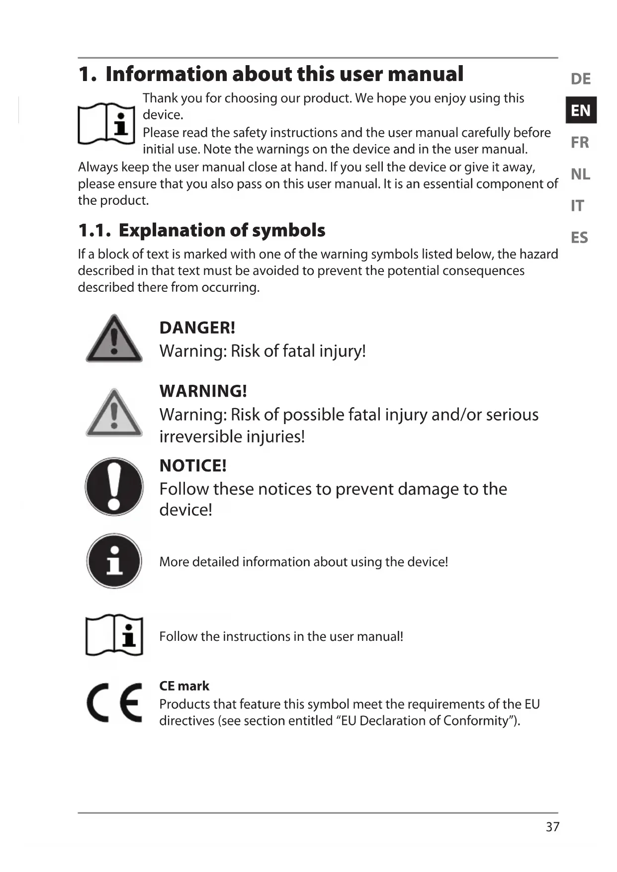 Thank you for choosing our product. We hope you enjoy using this device. Please read the safety instructions and the user manual carefully before initial use. Note the warnings on the device and in the user manual. Always keep the user manual close at hand. If you sell the device or give it away, please ensure that you also pass on this user manual. It is an essential component of the product. 1.1. Explanation of symbols If a block of text is marked with one of the warning symbols listed below, the hazard described in that text must be avoided to prevent the potential consequences described there from occurring. DANGER!